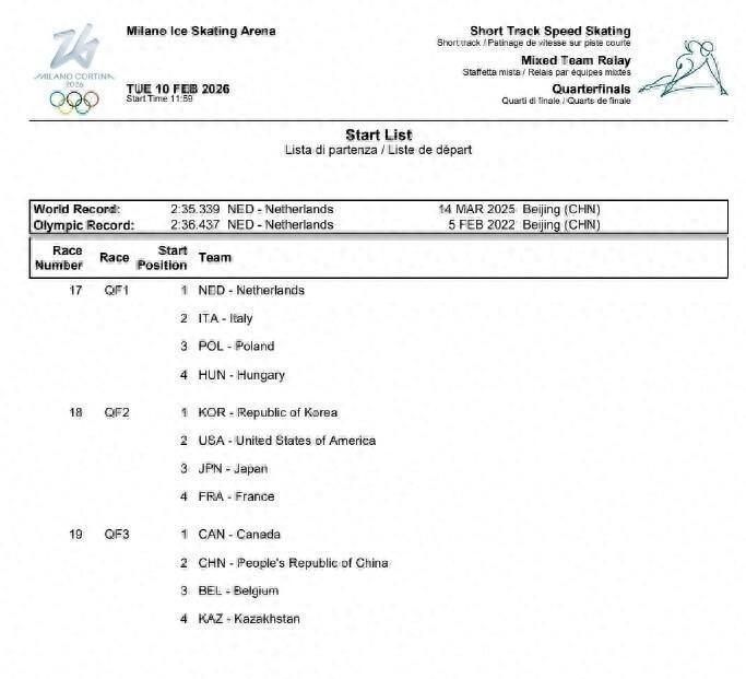 重点预告! 2月10日20点锁定央视! 今天是米兰冬奥会的第四个比赛日,今晚的焦点是短道速滑混合团体接力,这是中国队的王牌项目,也是本届冬奥会短道速滑的首枚金牌。 🥇 今日核心夺金点: * 短道速滑混合团体接力 * 时间:今晚 18:59(北京时间) * 看点:中国队由林孝埈、刘少昂、范可新领衔,是卫冕冠军。今晚将直接进行1/4决赛、半决赛和决赛,是今日最稳的冲金点。 今日其他重点赛事: 除了冲金项目,今天还有多位名将登场亮相,为后续比赛热身: * 短道速滑 女子500米预赛:17:30开始,范可新、王欣然出战。 * 短道速滑 男子1000米预赛:18:10开始,林孝埈、刘少昂出战。 * 自由式滑雪 男子坡面障碍技巧决赛:19:30开始,中国选手冲击奖牌。