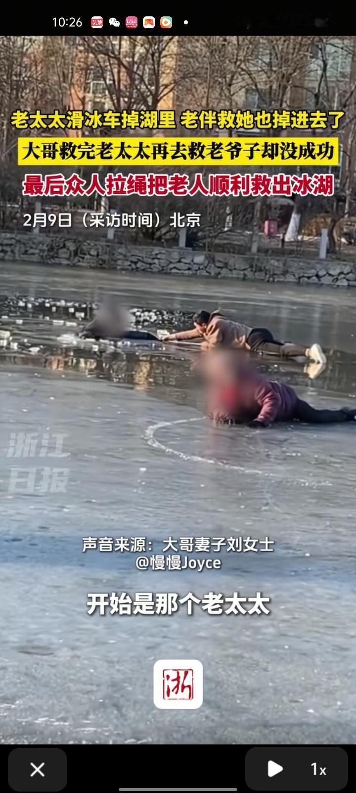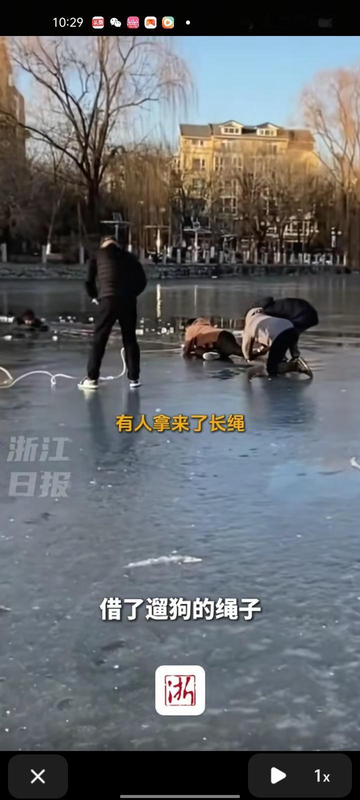 2月9日,北京。女子发视频称,一位老太太在湖面滑冰车不慎掉进湖里,老伴也去救她也掉进湖里,自己的丈夫看到后,先把老太太拉起来,等把老爷拉起来的时候,冰面已经很松了,因为太远了抛绳子够不到。恰好遇到了遛狗的邻居,赶紧去借遛狗的绳子,把绳子拉到最长,最后成功把老爷拉上岸。 看了整个救援过程可真后怕,天气渐暖,大家要谨慎下冰