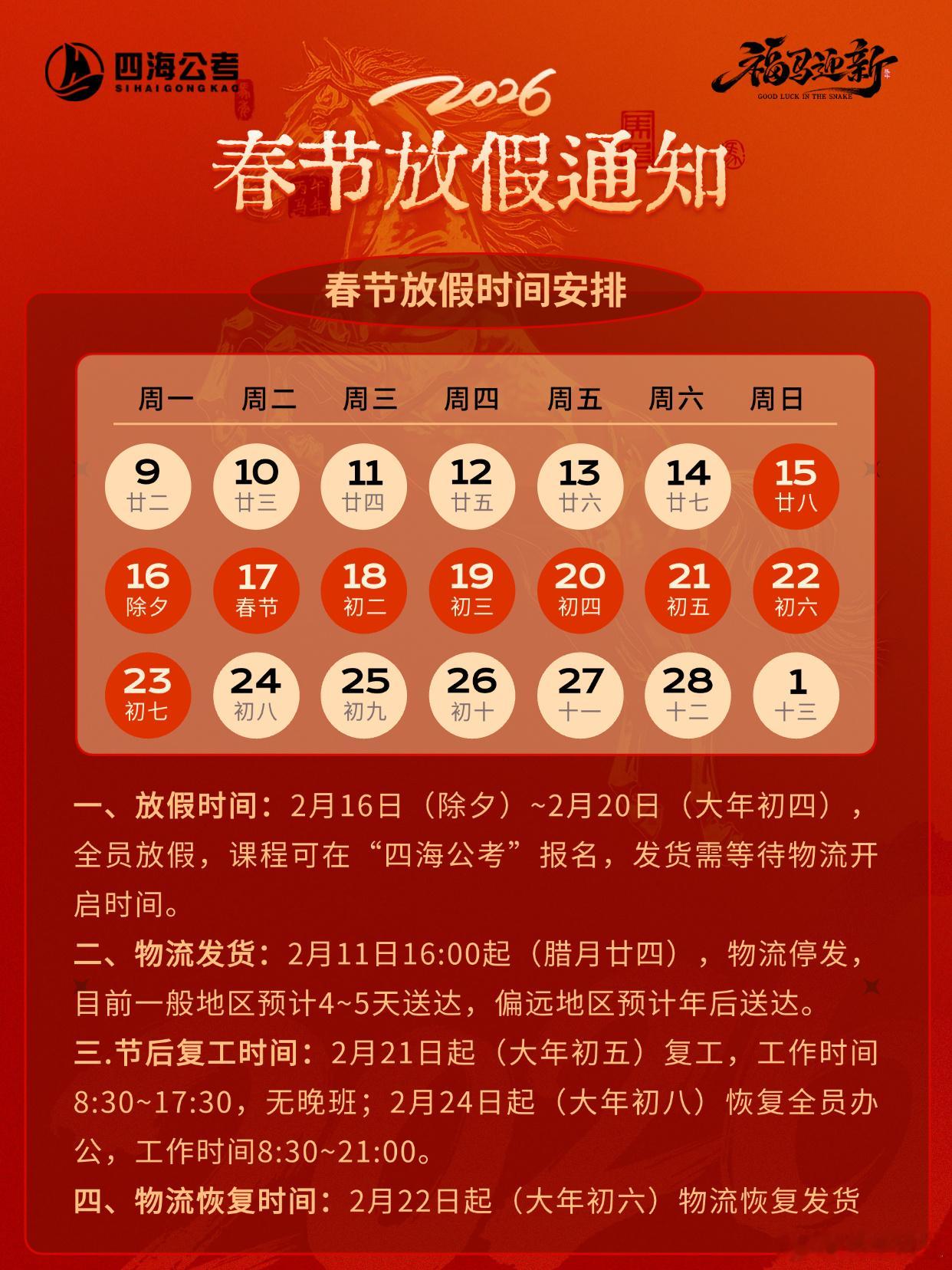 同学们,今天说一下春节讲义的发货安排快递物流计划于2月11号16:00起停运,2月22号(初六)恢复正常我们的省考二期套题班将于2月12号开课过年期间有学习打算的小伙伴,可以在11号中午前报名,保证讲义正常发出。花生老师提前祝同学们新春快乐,马年马上上岸!省考公务员