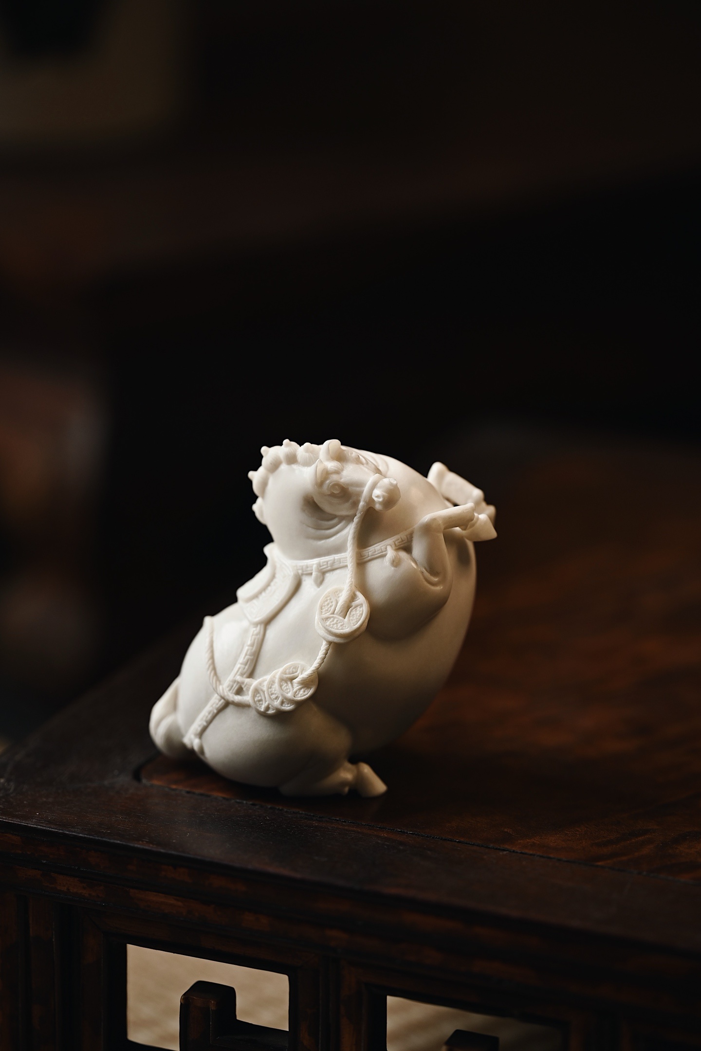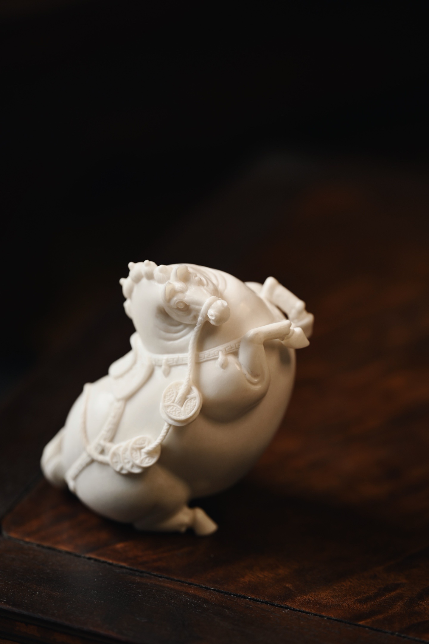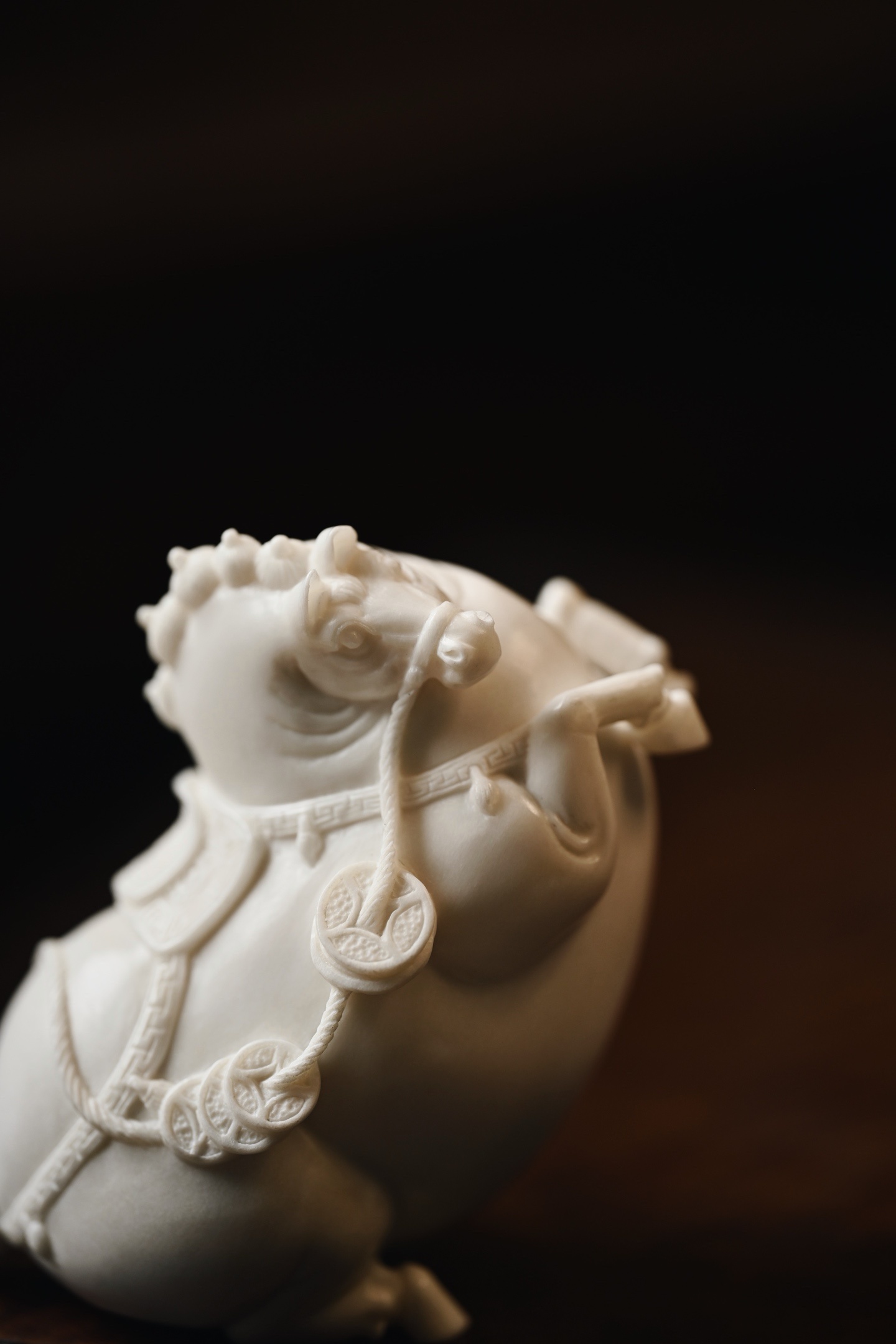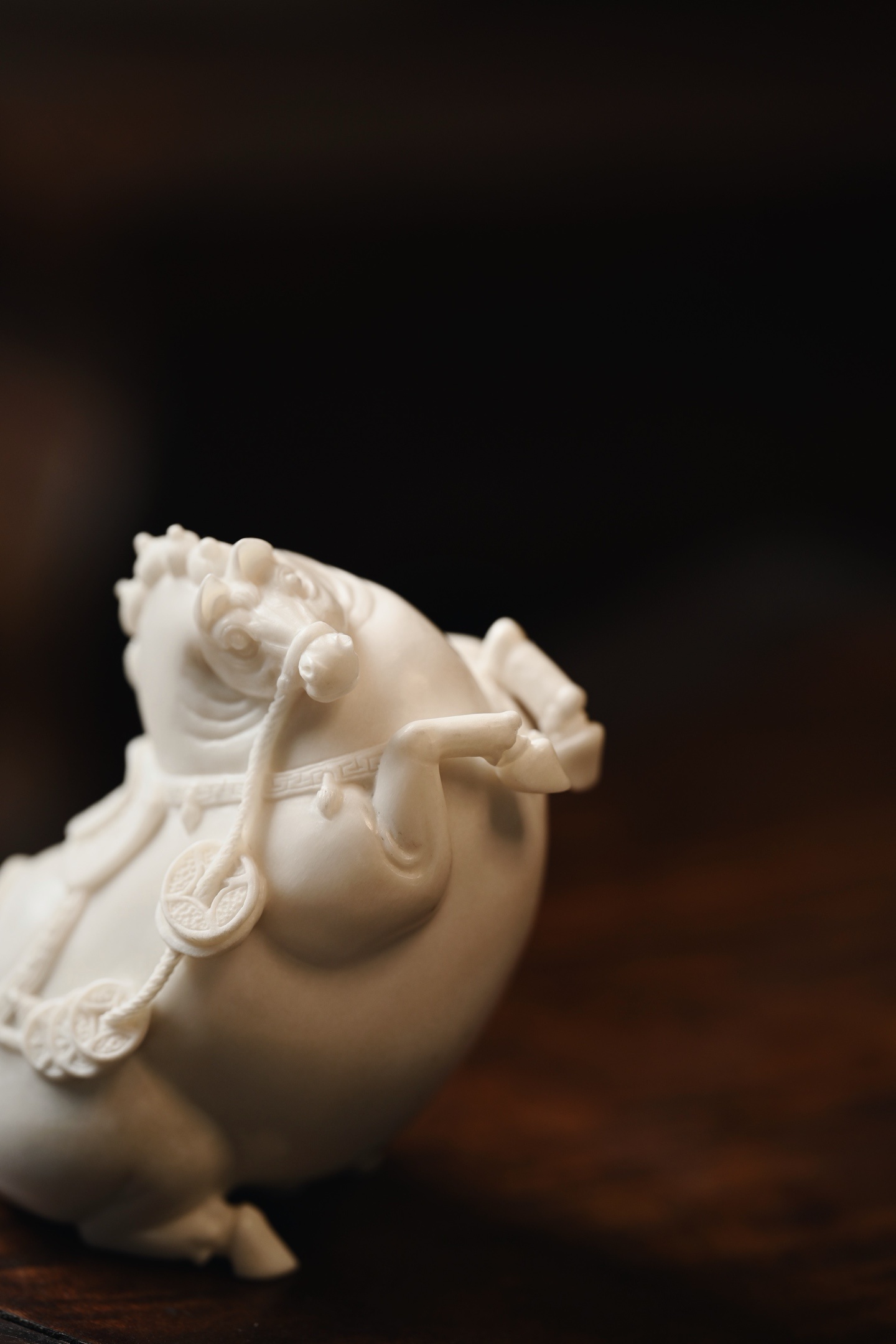 取材质密凝润,圆雕饱满结实,塑形写神颇具气势,骏马立姿,背驼铜钱,立形达意,祝颂“马上有钱”。