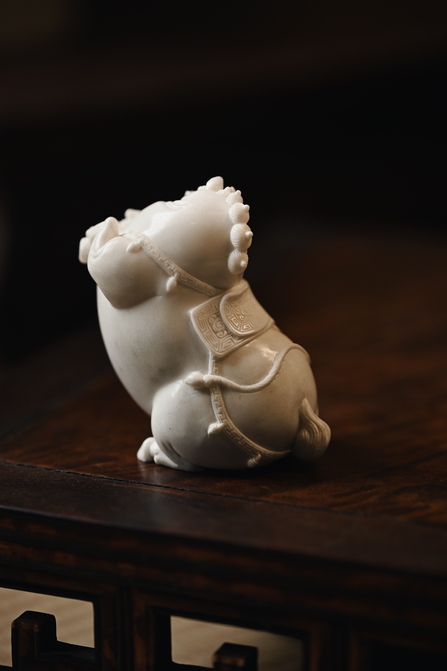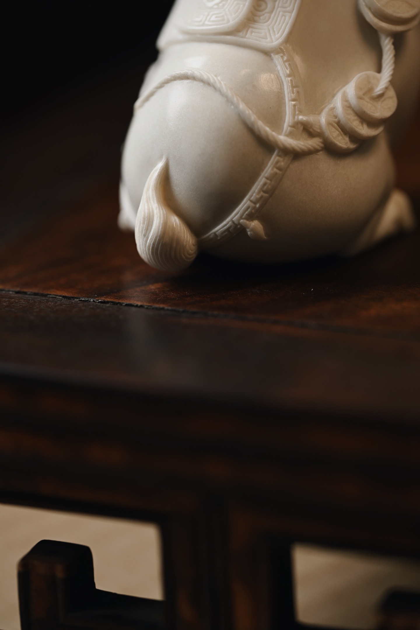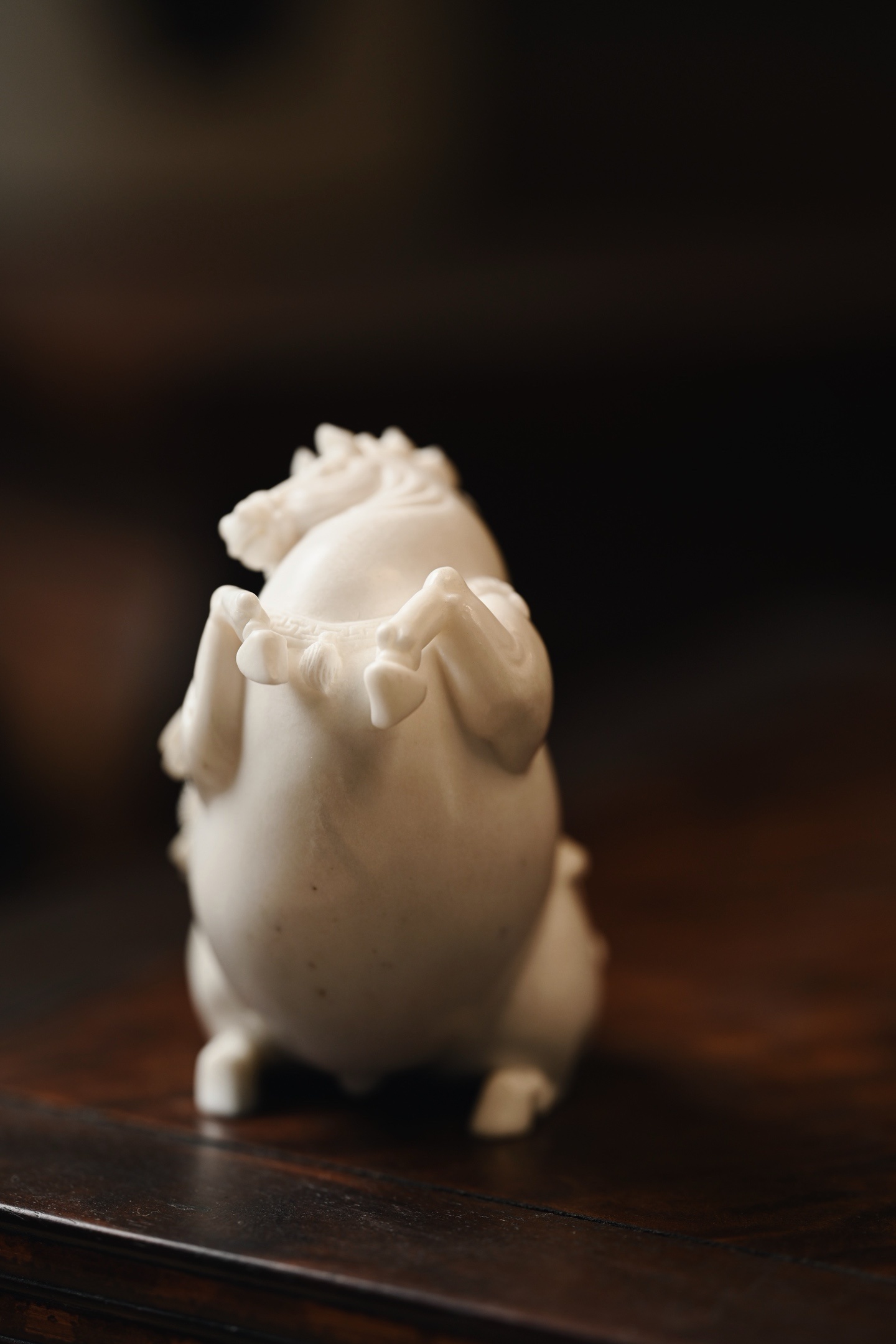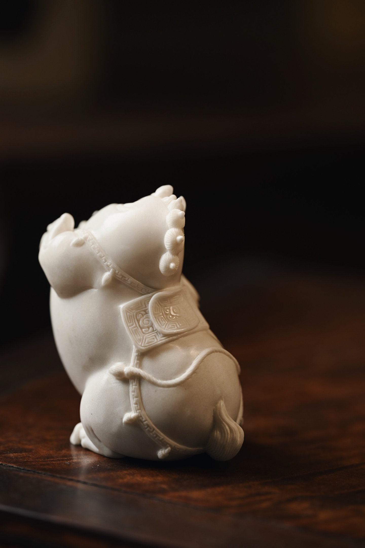 取材质密凝润,圆雕饱满结实,塑形写神颇具气势,骏马立姿,背驼铜钱,立形达意,祝颂“马上有钱”。