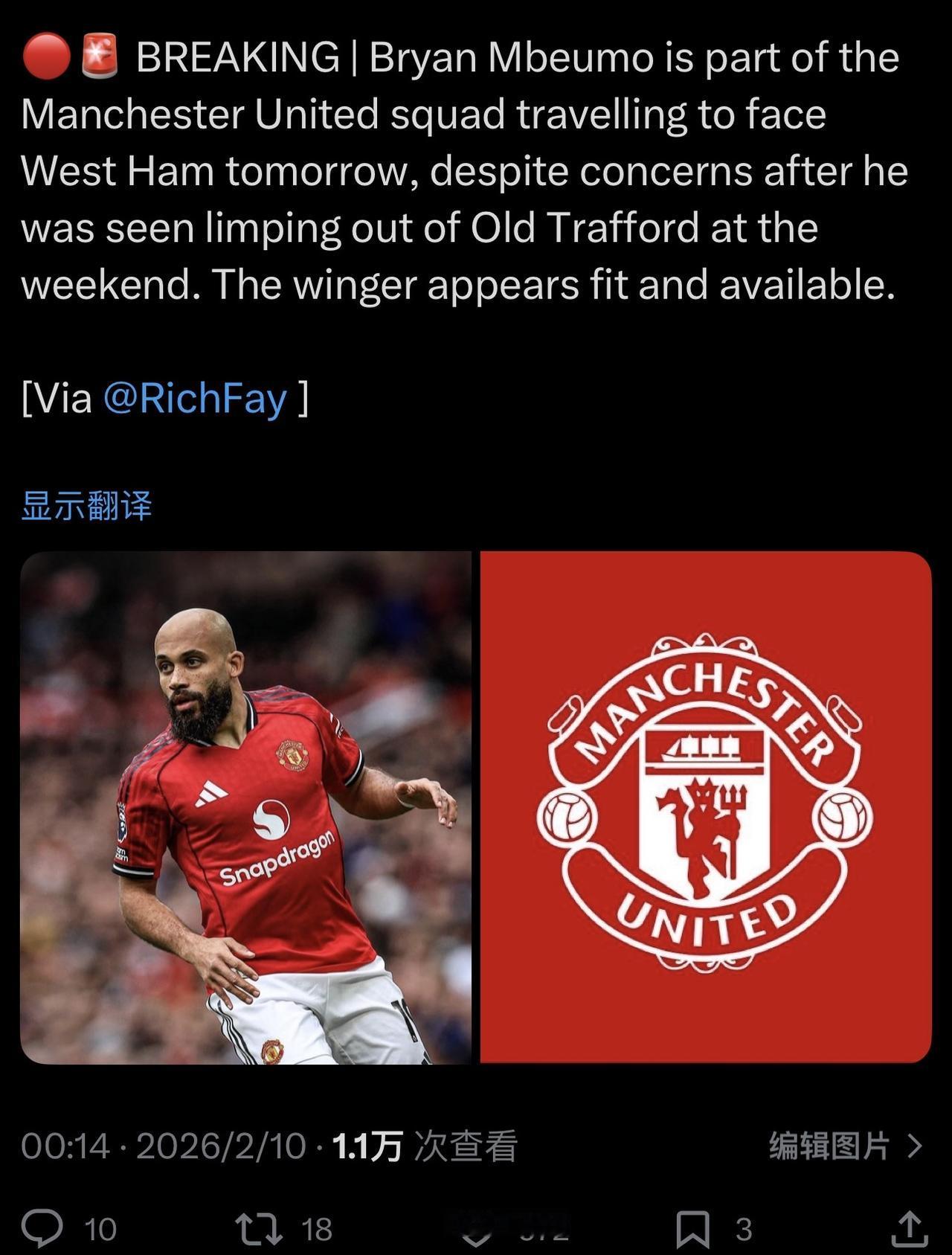 如今哪能少了老詹啊,真大腿🦵 ……………………………………………………………… 突发新闻 | 尽管周末布莱恩·姆贝莫在老特拉福德球场一瘸一拐地离开,引发了一些担忧,但他仍将随曼联前往西汉姆联队,参加明天的比赛。这位边锋看起来身体状况良好,可以出战。