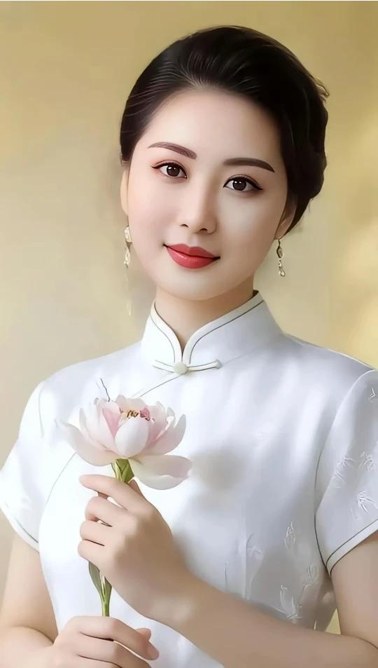 出水芙蓉,亭亭玉立。 明眸皓齿,美若冠玉。 优雅旗袍,国风古韵。 手持莲花,东方之美。 沉鱼落雁,闭月羞花。