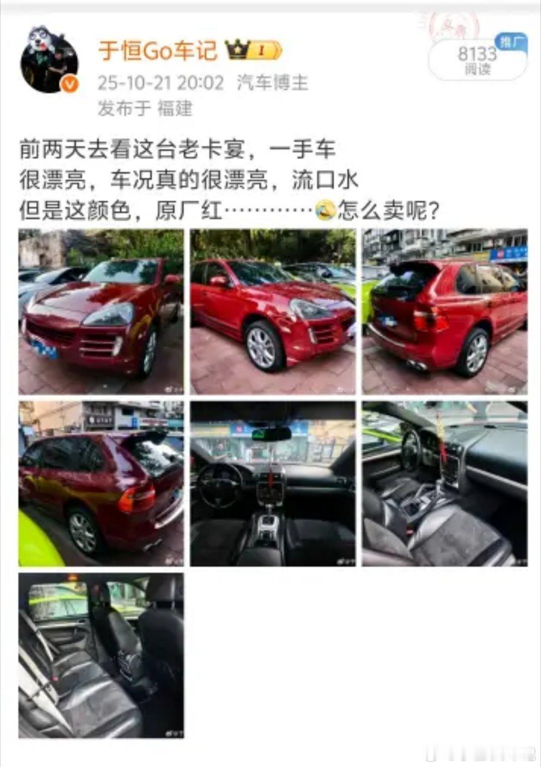 路上遇到一台红色老卡宴,跟我之前看的应该是同一台吧,原厂这红色应该也很难有第二台了而且外观看着也是那么亮于恒的二手车日常