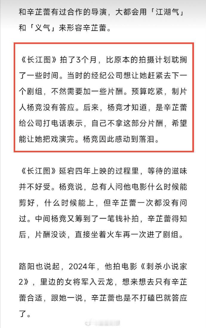 辛芷蕾不分片酬也要把长江图演完 救命!这才是真正的演员😭 辛芷蕾面对《长江图》拍摄延期、预算吃紧的困境,主动放弃追加片酬,不分片酬也要把角色演完,这份对作品的敬畏,远比片酬珍贵。