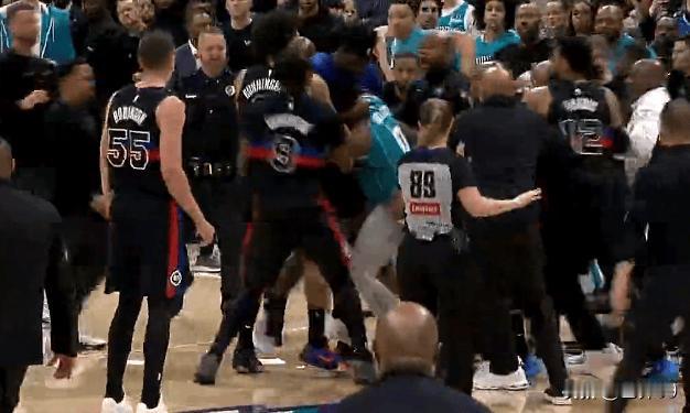 NBA火爆冲突!活塞黄蜂上演拳击大战,杜伦迪亚巴特互殴,斯图尔特替补冲场,四人直接驱逐 NBA常规赛活塞对阵黄蜂,第三节爆发本赛季最激烈大规模冲突,瞬间引爆全场。杜伦与迪亚巴特在卡位对抗后发生口角,随即顶牛、掌掴,迪亚巴特暴怒挥拳反击,场面彻底失控。布里奇斯上前为队友出头与杜伦缠斗,斯图尔特从替补席冲入场内挥拳互殴,两队球员、教练组迅速围拢,险些引发群殴。 裁判经录像回放,将迪亚巴特、杜伦、布里奇斯、斯图尔特四人全部驱逐。按照NBA规则,替补冲场的斯图尔特将面临至少一场禁赛与高额罚款,其余动手球员也难逃处罚。最终活塞110-104击败黄蜂,终结对手9连胜,坎宁安轰下33分9篮板7助攻带队取胜。这场冲突成为比赛焦点,联盟大概率追加重罚,两队后续赛程与阵容都将受到影响。
