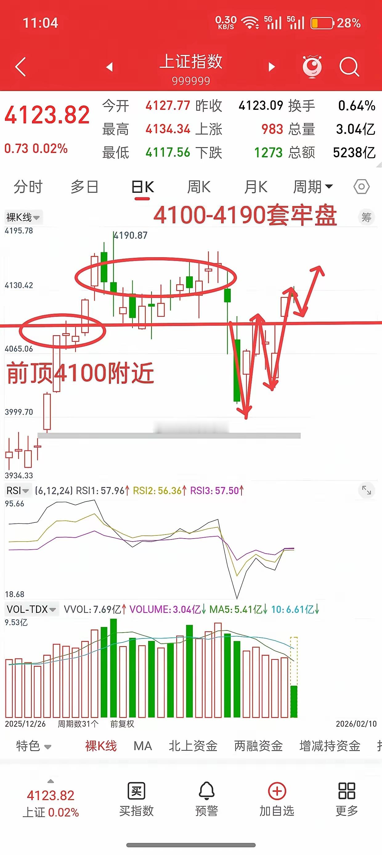 A股,上午冲高回落,后市应对策略!截止目前,缩量1000亿,缩量是正常的,回顾每一年春节前一周,基本都是缩量的。再看技术形态,上周跌破4100-4080前顶平台,加速下跌筑双底,昨天站上前顶,因此,接下来行情很清晰,前顶只要守住,多头没问题。回踩的力度,也会有限,因为下方有5-10-20日均线,4100-4110附近。然后五周均线也是4108。而上方有4100-4190套牢盘,行情往上冲一冲,就会回落下,但回踩力度又有限。因此,就是这种情况,耐心等待吧,空仓的想进场,回踩均线附近都可以,持仓的仓位不重的话,完全可以卧倒。