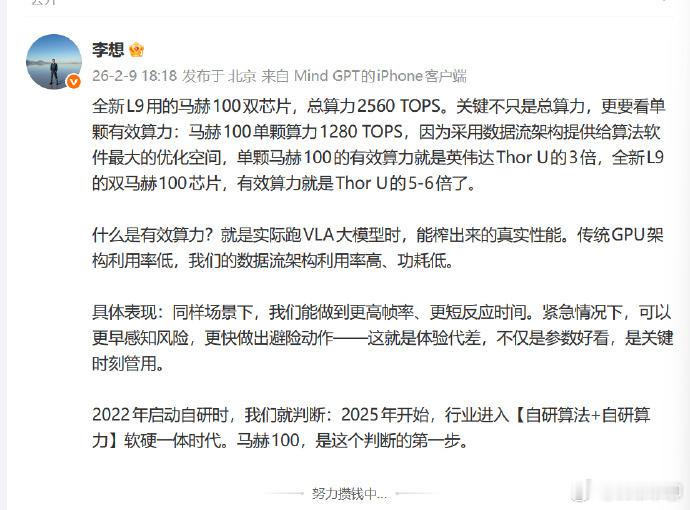 李想:L9的马赫100芯片,有效算力是英伟达ThorU的三倍。这一刻,李想和大