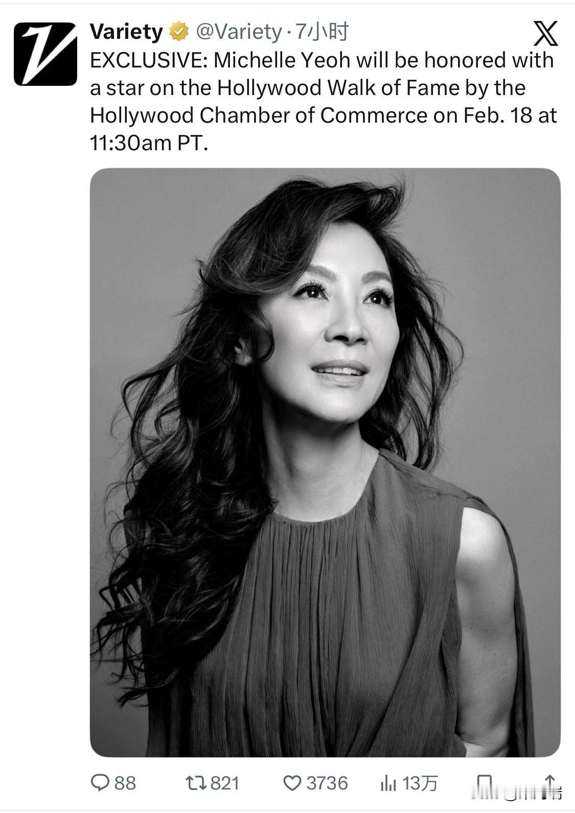 好莱坞商会已正式宣布,奥斯卡影后杨紫琼(Michelle Yeoh)将于太平洋时间 2026 年 2 月 18 日上午 11:30 在好莱坞星光大道(Hollywood Walk of Fame)揭晓她的专属星位。 以下是颁奖典礼的详细信息: 颁奖嘉宾:杨紫琼将被授予好莱坞星光大道第 2,836 颗 星座,类别为“电影类”(Motion Pictures)。 具体地点:仪式将在好莱坞大道 6927 号(6927 Hollywood Boulevard)举行。 观看方式:由于 好莱坞星光大道官网 负责组织此类活动,通常会在官方网站进行现场直播。 历史意义:杨紫琼作为“2024届”入选者,是首位获得奥斯卡最佳女主角的亚裔演员,此次留星是继她获得多项国际大奖后的又一里程碑。 值得注意的是,Variety 等媒体在发布此消息时因使用了黑白照片,一度引发影迷“虚惊一场”,但官方已确认这是庆祝其职业生涯巅峰的荣誉时刻。