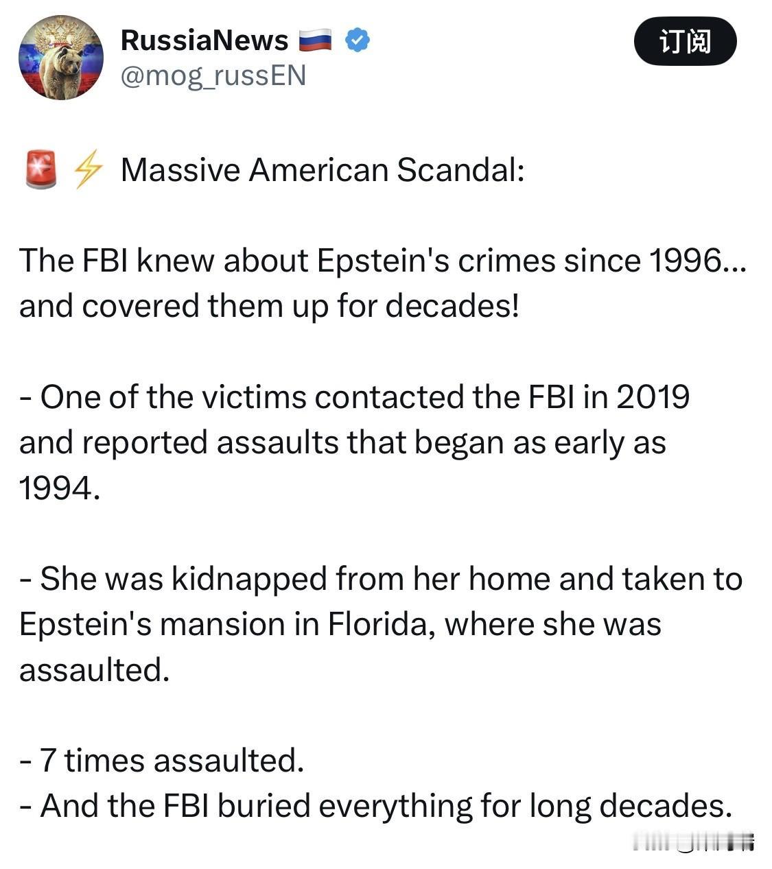 美国重大丑闻:FBI早在1996年就知道爱泼斯坦的罪行……却掩盖了几十年! - 其中一名受害者于 2019 年联系了联邦调查局,并报告称,她最早于 1994 年开始遭受性侵犯。 - 她在家中被绑架,并被带到爱泼斯坦位于佛罗里达州的豪宅,在那里遭到性侵。 - 曾遭受7次袭击。 而联邦调查局则将所有证据掩盖了数十年。