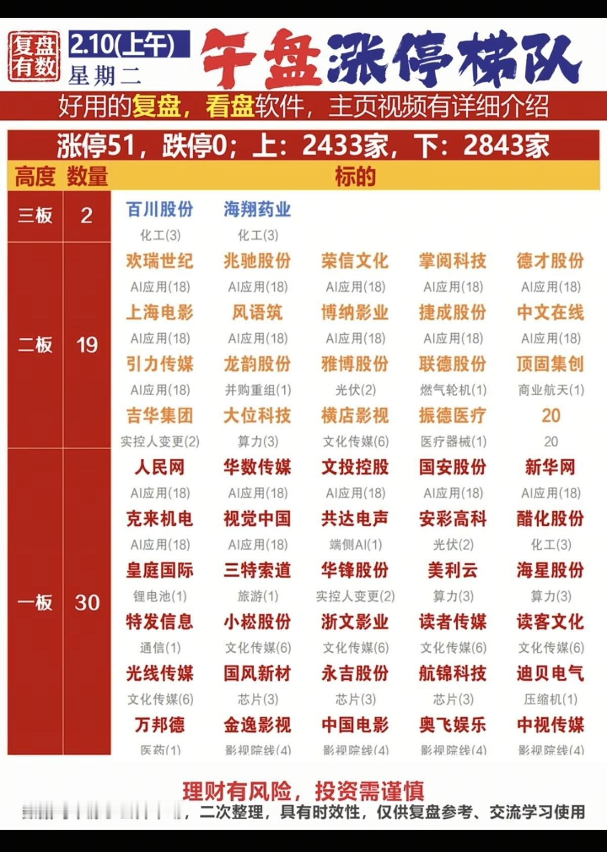 2.10周二 涨停板股票:复盘统计! 涨停板51家,跌停0家 涨跌比2433:2843 焦点:AI应用、文化传媒,化工、通信