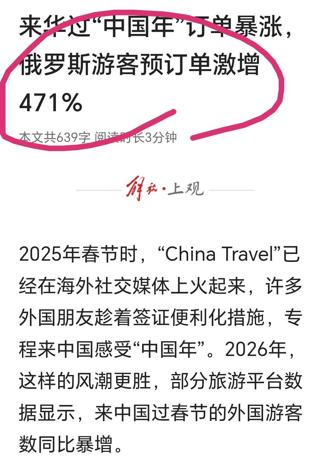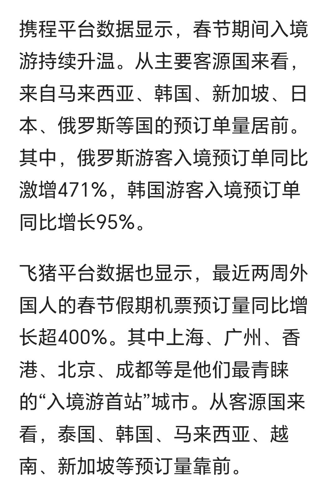 谁说老外不爱凑热闹?这不就来了吗?一年当中,中国最热闹的时候,他的们成群结队跑中国来过年了。 俄罗斯来中国的订单居然暴涨471%,连一向自大惯了敢在美军基地上建国的宇宙第一强国韩国,他们来中国的人增长了快一倍。 不过仔细看看,会发现主要还是周边国家,泰国马来西亚新加坡越南韩国日本俄罗斯……勉强加上土澳。基本上还是以中华文化圈为主。 什么时候世界各地都将中国春节定为法定假期,这个时候我们才可以说实现了我们的目标。[偷笑] 点右上角关注我,我们一起去看这个魔幻的世界