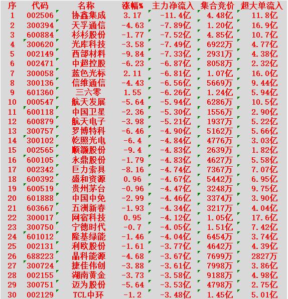 2月10日上午盘,主力趁低位,大幅买入的30名单 N电科:涨幅 +558.71%,净流入 24.2亿元 光线传媒:涨幅 +20.00%(涨停),净流入 7.86亿元 阳光电源:涨幅 +1.29%,净流入 6.20亿元 新易盛:涨幅 +1.24%,净流入 5.78亿元 中文在线:涨幅 +20.01%(涨停),净流入 5.35亿元 2月10日中午收盘,主力资金“大幅卖出”的30名单: 协鑫集成:涨幅 +3.17%,净流出 11.4亿元 天孚通信:跌幅 -4.63%,净流出 7.89亿元 杉杉股份:跌幅 -1.77%,净流出 7.52亿元 光库科技:跌幅 -3.58%,净流出 7.49亿元 西部材料:跌幅 -9.84%(接近跌停),净流出 7.33亿元
