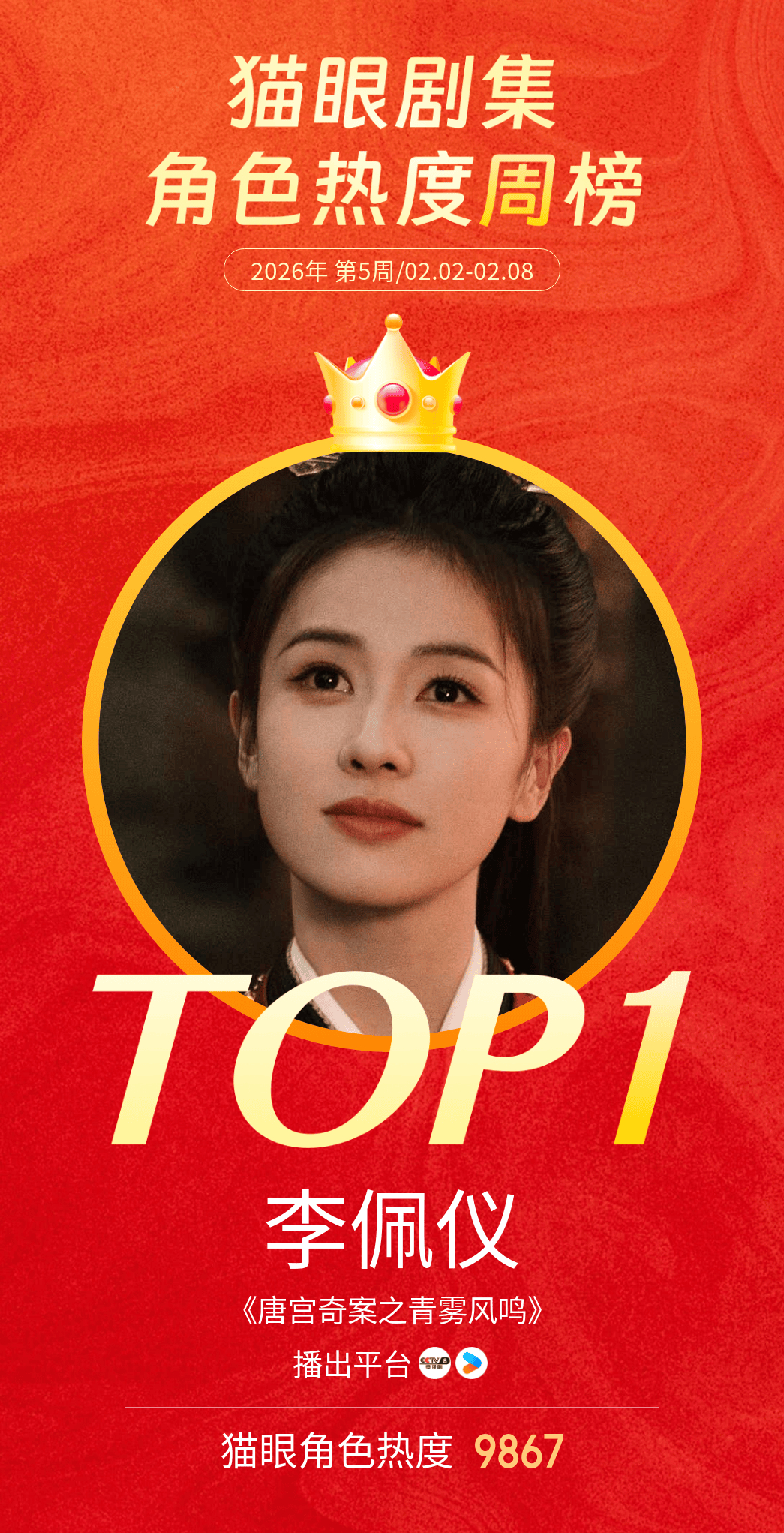 白鹿李佩仪角色热度冠军 据猫眼专业版数据,在《唐宫奇案之青雾凤鸣》中饰演的“李佩仪”成为猫眼角色热度榜冠军!2026第5周猫眼角色热度榜