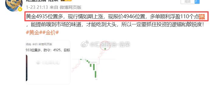 黄金4935位置多,在4946位置多单止盈110个点利润