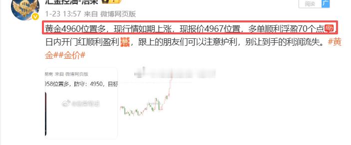 黄金4960位置多,在4967位置多单止盈70个点利润