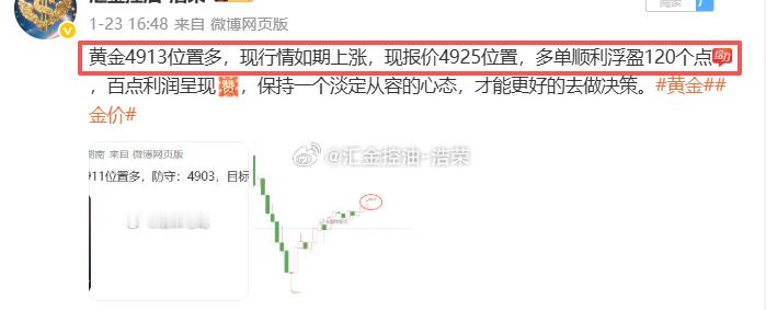 黄金4913位置多,在4925位置多单止盈120个点利润