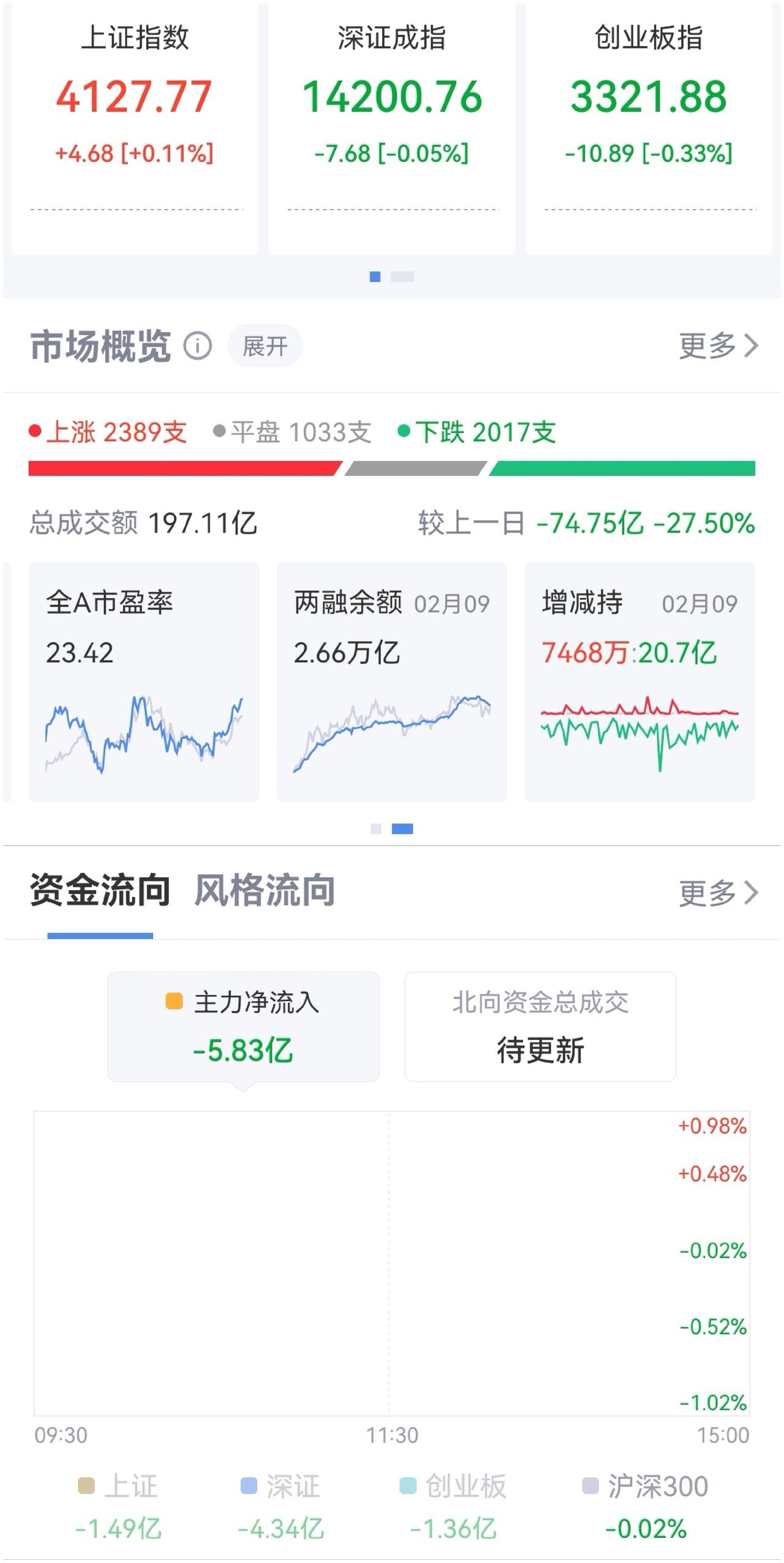 午盘印象(2月10日) AI叙事仍犹豫 量能不济 外围:美股续反弹 科技涨幅收窄 内股:科技分化 个股谨慎 指数震荡 一、三大股指开盘红绿: 指数开盘几乎均势 个股开盘涨平跌比率44%:19%:37%。 个股开盘略强(+7 Vs +83个百分点), 大幅反弹之后 个股谨慎 二、早盘冲高回落 量能无力 仍看反抽 半日1.39万亿,量能又扩张 三、涨跌幅榜: 科技分化 红利震荡 非银分化 跌幅前列:商业航天、金属、自贸区 涨幅前列:AI应用、医药、算力 四、开盘和午盘: 开盘:沪+0.11%、深-0.05%、创-0.33%。 午盘:沪-0.02%、深-0.02%、创-0.14%。 AI应用连续强势,活跃盘面 五、午盘个股上涨45%,与昨日涨跌差距(-8 Vs +65个百分点),个股回落无力连涨 相比开盘,涨跌差稍许下降,下跌个股增加 资金-318 ( +278 )亿,资金大幅流出 六、沪深两市成交量午盘13,936亿,上个交易日14,910亿,同比量能萎缩近1,000亿,量能多日低位,连续反弹受挫。 七、指数反弹无力,量能萎缩,震荡整理 融资额连续降7天、昨日+5亿,降杠杆近尾声。情绪已平稳,盘面也平平,节日气氛升温 午后两种情形: 1、横盘震荡:谨慎乐观,震荡消化,时间换空间。 2、震荡下跌:AI硬件又犹豫,回调也健康,大起大落,慢牛格局未变。 (图片源自网络侵权告知删除)