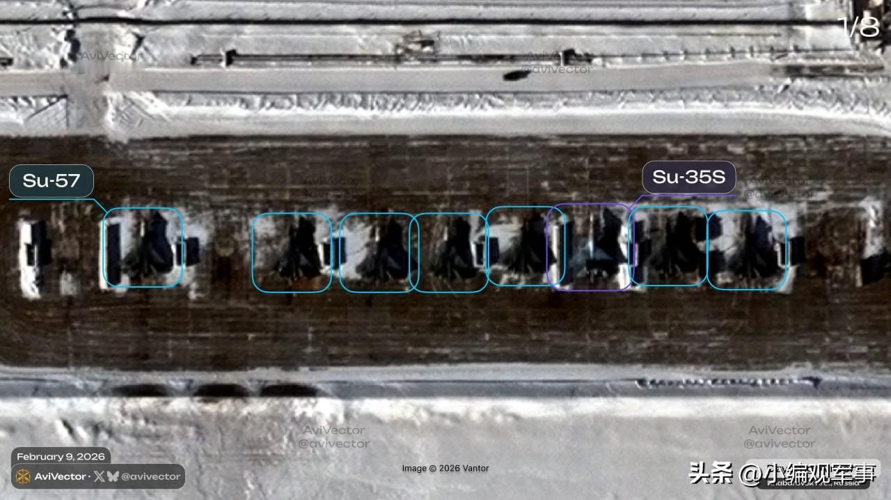 2月9日的卫星图显示,俄罗斯远东地区阿穆尔河畔共青城的Dzyomgi空军基地部署了15架苏-57战斗机、18架苏-35S战斗机、3架米格-31BM战斗机,以及2架米-8直升机。 这次卫星图首次捕捉到苏-57战斗机在露天停放的数量创纪录的场景。