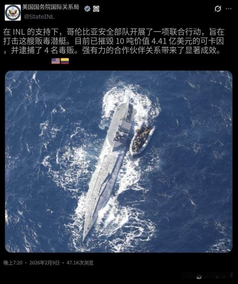 🇺🇸🇨🇴美国国务院下属的国际麻醉品和执法局宣称,在其支持下,哥伦比亚安全部队打击了一艘“贩毒”船只,导致“价值4.41亿美元的10吨可卡因已被销毁”,4名“毒贩”被逮捕。