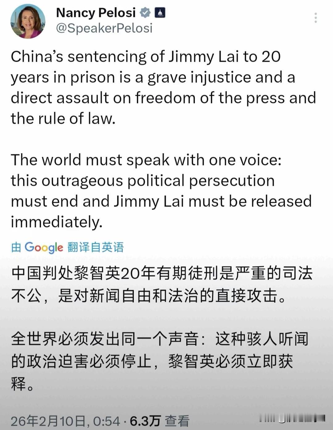佩洛西跳出来为乱港分子喊冤 佩洛西公开为黎智英站台。 北京时间2月10日,美国前众议长佩洛西发文,称黎智英获刑20年是司法不公,是对新闻自由与法治的攻击,呼吁国际社会施压放人,要求立即释放黎智英。 香港法院2月9日对黎智英作出判决,黎智英串谋勾结外国势力、发布煽动刊物等罪名成立,被判处20年监禁。案件审理历时超百天,证物与文件堆成小山,证据链完整闭环。 黎智英勾结外部势力搅乱香港秩序,触碰国家安全红线,判决是香港法治的正常落地。 佩洛西拿双重标准说事,无视自身窜访台湾、插手香港事务的黑历史,这番操作纯属政治作秀。 中方坚定维护司法主权,不接受任何外部指手画脚。 你怎么看佩洛西这波操作?
