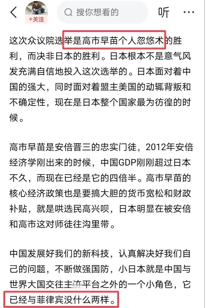 胡锡进在评论高市早苗选举大胜时呓语连连,充满了精神胜利法,理由如下。 第一,胡锡