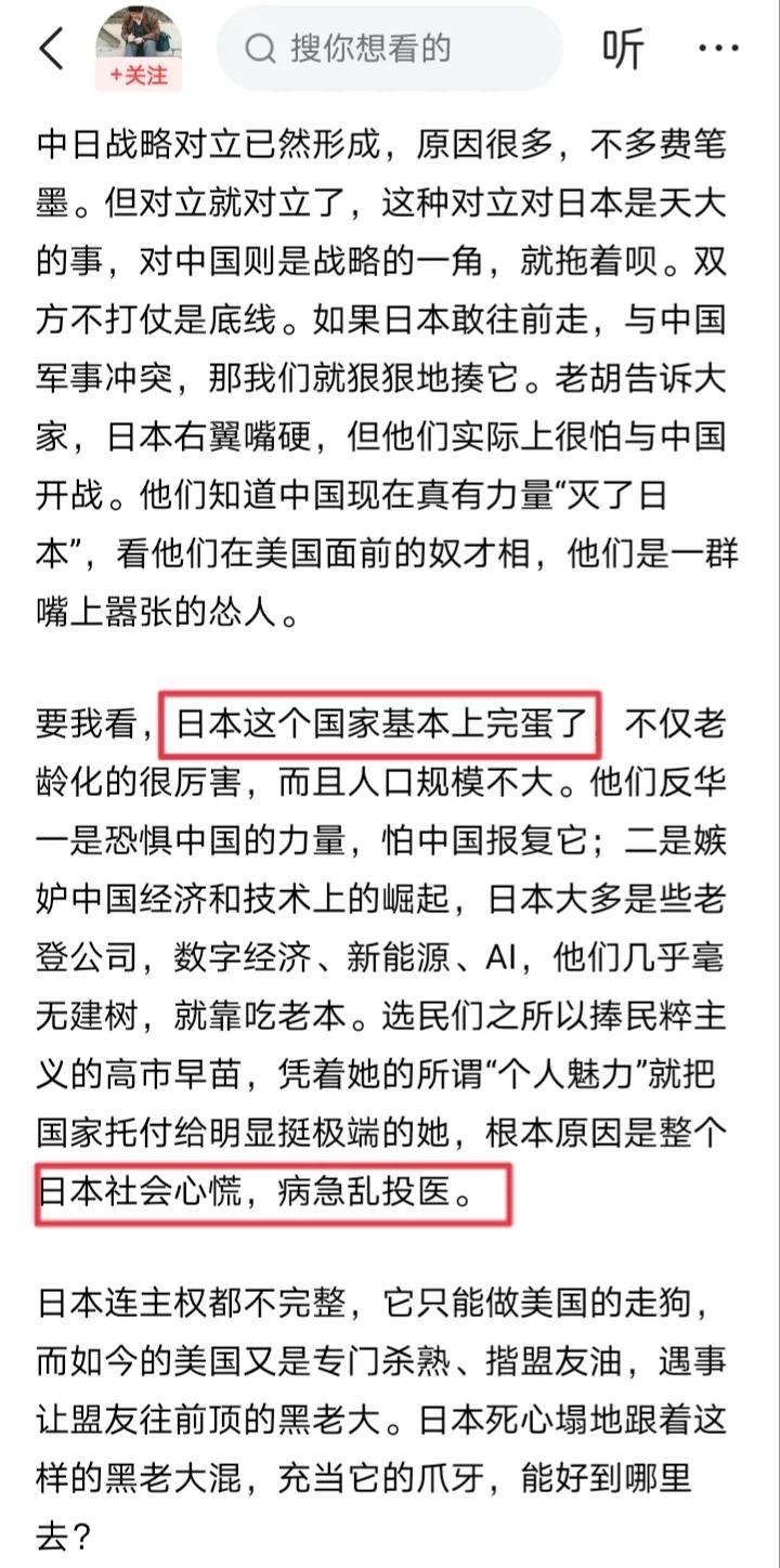 胡锡进在评论高市早苗选举大胜时呓语连连,充满了精神胜利法,理由如下。 第一,胡锡进说日本的选举结果反映了“愚蠢的民意”,老胡声称“这届选民有多蠢”。问题是日本人口一亿多,有选举资格的选民也有几千万,难道这几千万人都愚蠢吗?与其相信胡锡进说的几千万人愚蠢,我宁可相信老胡一个人愚蠢。 第二,胡锡进说这次选举是“高市早苗个人忽悠术的胜利”,老胡声称“她一忽悠,选民就把多数席位给了自民党”。问题是高市早苗的行动也很果断,不仅拒不道歉还加强军备甚至准备修宪。与其相信胡锡进说的高市早苗忽悠日本选民,我宁可相信老胡在忽悠国内民众。 第三,胡锡进说“日本这个国家基本完蛋了”,老胡声称日本“已经与菲律宾没什么两样”。问题是日本的经济实力高居全球第四,日本的海军实力高居全球第三,哪里是菲律宾能比的呢?与其相信胡锡进说的日本基本完蛋,我宁可相信老胡的精神胜利法快要完蛋。 那么胡锡进不顾现实只会口嗨,老胡是老糊涂了吗?