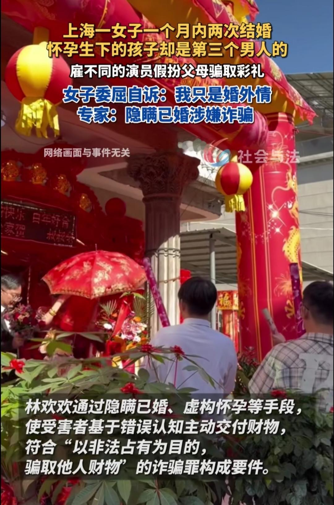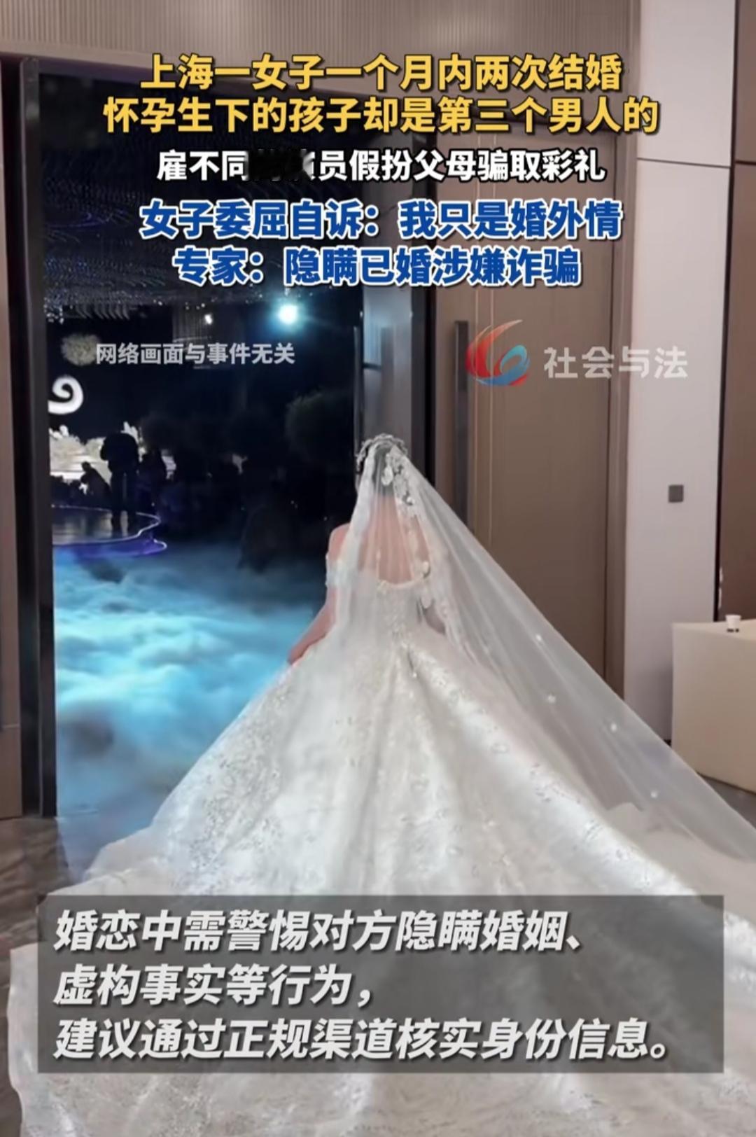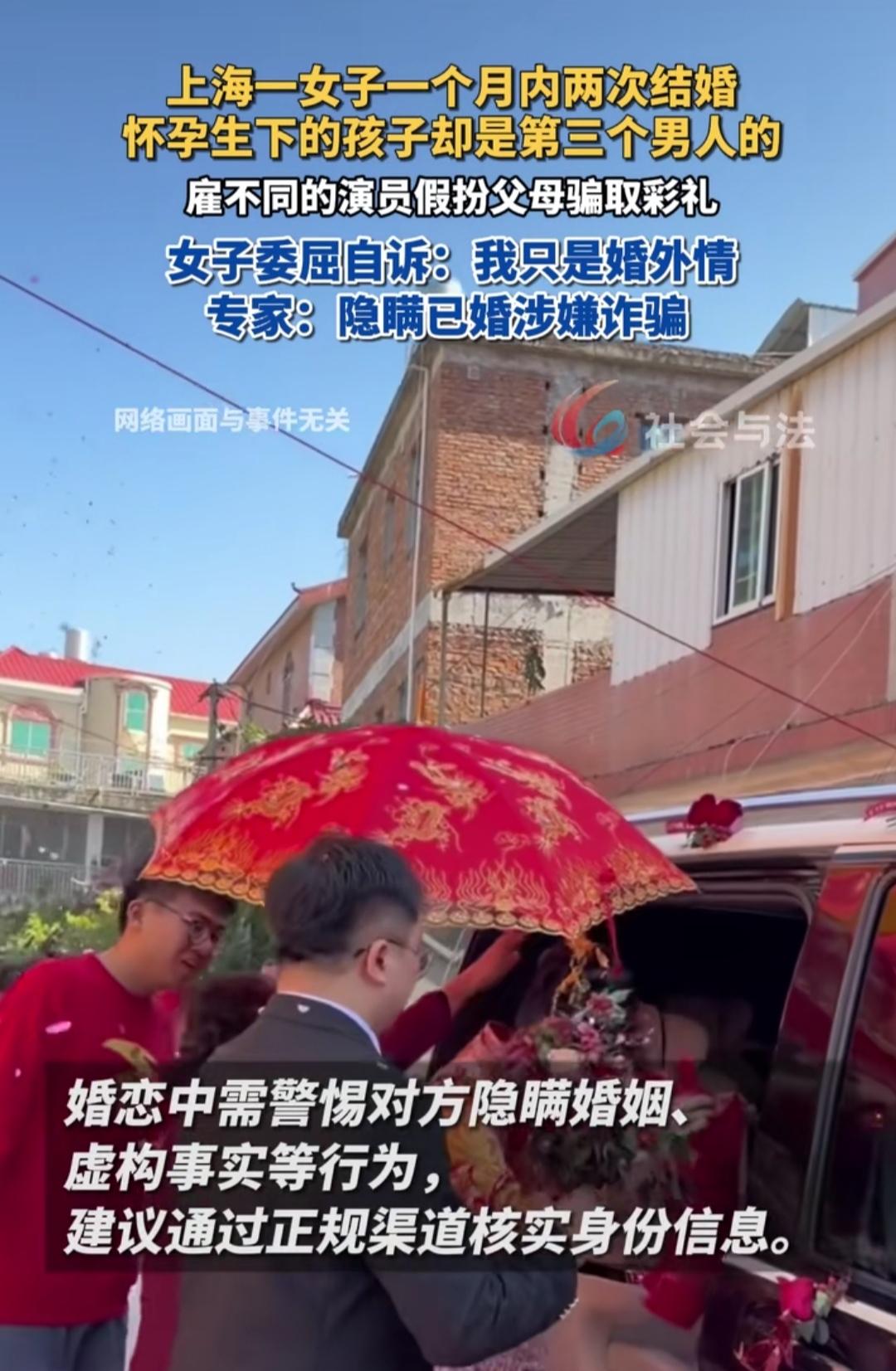 谁能想到谈个恋爱竟遇上这种离谱事!上海一女子的婚恋操作直接刷新三观,短短一个月接连和两个男生办婚礼,转头生下的孩子,亲爹却是第三个人,这剧情比电视剧还抓马,任谁遇上都得懵。 女子为了圆谎也是费尽心机,不仅雇演员装自己父母,还伪造孕检单假装怀孕,把和第三人生的女儿,分别扮成和两位新郎的孩子,借着恋爱的名义,不断找理由索要财物,把两个人都蒙在鼓里。 这场精心编织的骗局,最后还是因为细节露了馅,假岳父的声音穿帮,孩子的年龄、性别也对不上,两位当事人发现后赶紧报警,女子也因相关行为被警方调查逮捕,涉事的演员也在调查中。 看似离谱的背后,也藏着现实的无奈,催婚大环境下的情感焦虑,让不少人放松了警惕,也让一些灰色产业链有了可乘之机,这事儿也让大家看清,婚恋里的真心,从来都需要多一层核实和考量。