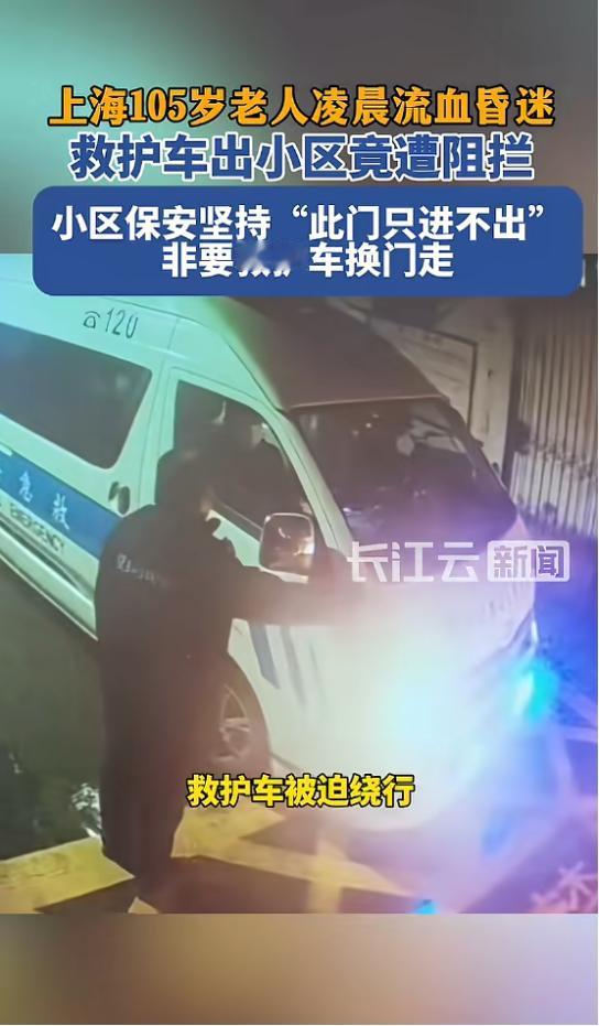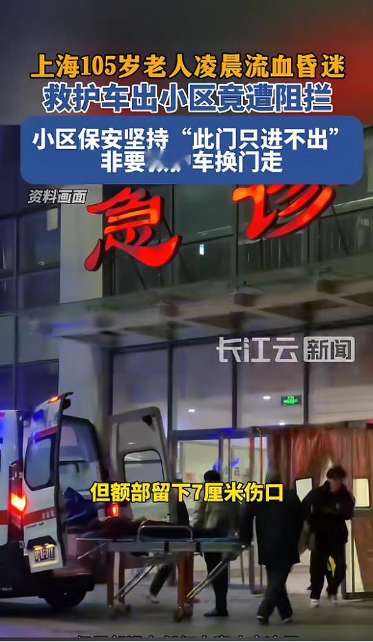 “必须严惩!”1月31日,上海,一105岁老人在家中摔倒,额头严重受伤,流血昏迷,在救护车运送过程中,因小区保安以“东门只进不出”为由,坚持让救护车换个门走,救护车只能绕行,被硬生生耽误5分钟!网友:拿着鸡毛当令箭! “人命关天啊师傅!求求你通融通融!”1月31日凌晨,上海某小区门口,救护车上的家属几乎带着哭腔哀求保安。 车上躺着的是105岁的孟阿婆,刚刚在家摔倒,额头裂开一道大口子,血流不止,已经昏迷过去。时间就是生命,可偏偏就在这节骨眼上,被小区东门的保安拦住了。 原来,小区规定东门“只进不出”,保安死活不肯抬杆放行,坚持让救护车绕到南门出去。急救人员反复解释这是重伤老人,情况紧急,但保安不为所动,只反复念叨:“这是规定,我不能违反。” 无奈之下,救护车只能倒车、掉头,多绕了两百多米,硬生生耽误了将近五分钟。这五分钟听起来不长,可对一个百岁高龄、颅脑重伤的老人来说,每一秒都可能是生与死的分界线。 好在孟阿婆最终抢救及时,没有生命危险,但额头上那道7厘米长的伤口,成了这场风波中最扎眼的证明。 此事也在网上引起热议,网友们气得口不择言:“如果这事发生在我身上,我就是把保安打一顿,也要让救护车出去!” 当然也有理智的网友点明了问题的关键:别光骂个人,也要看看背后的制度是不是太僵化了。 这话确实有道理,后来物业出面回应,承认特种车辆在紧急情况下,不应该受“只进不出”限制,保安完全可以自行放行。 可离谱的是,那名保安竟然突然改口,不再那“规矩”说事,而是把责任推到了系统故障上,说当时控制门禁系统的遥控和电脑都坏了,所以才开不了门。 可记者和物业经理现场一试,系统完全正常。这个借口显然站不住脚,反而更让人反感、愤怒。 值得庆幸的是,孟阿婆挺过来了,目前还在修养,但这不代表此事就能翻篇。物业公司已经道歉,说要培训员工、检修设备。 可比这些更重要的,是让所有一线工作人员明白:在生命面前,规则是可以被打破的。因为这是对生命最本能的敬畏与关照,也是一个文明的社会应该具备的温度与善意。 对此你有什么看法?欢迎在评论区留言讨论。救护车 物业保安 信息来源: 长江云新闻|《105岁老人凌晨流血昏迷,救护车出小区遭阻拦》 文|墨海 编辑|史叔