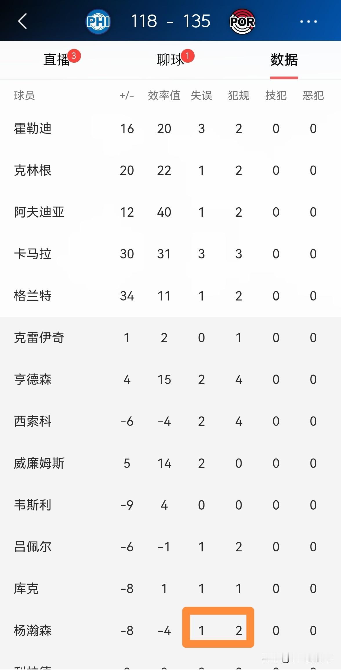 开拓者新秀杨瀚森真是太喜欢浪投三分了!在今天开拓者主场以135:118大胜76人的比赛中,杨瀚森替补出战5分钟,投篮4中1,其中三分球3中0非常低效的得到2分,还有1次失误和2次犯规,他的场上正负值为-8。 实事求是的说,以杨瀚森目前的三分投射能力来看,他应该减少甚至停止三分出手,他应该在有限的出场时间里尽量做自己擅长的事情,只有这样杨瀚森才能给球队提供有价值的帮助,进而获得更多的上场时间。
