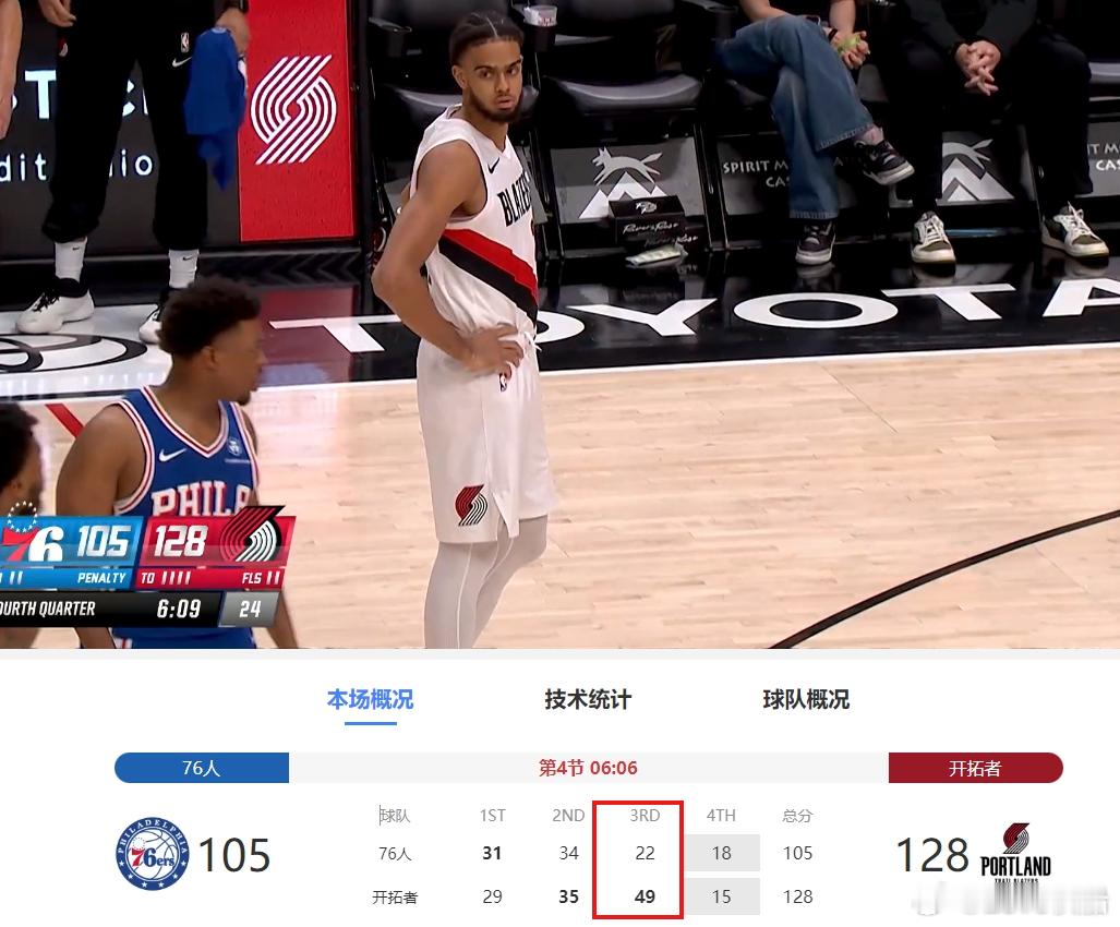 费城单节被开拓者轰出了49分,这比赛基本上没悬念了,今天过后又得回第十!