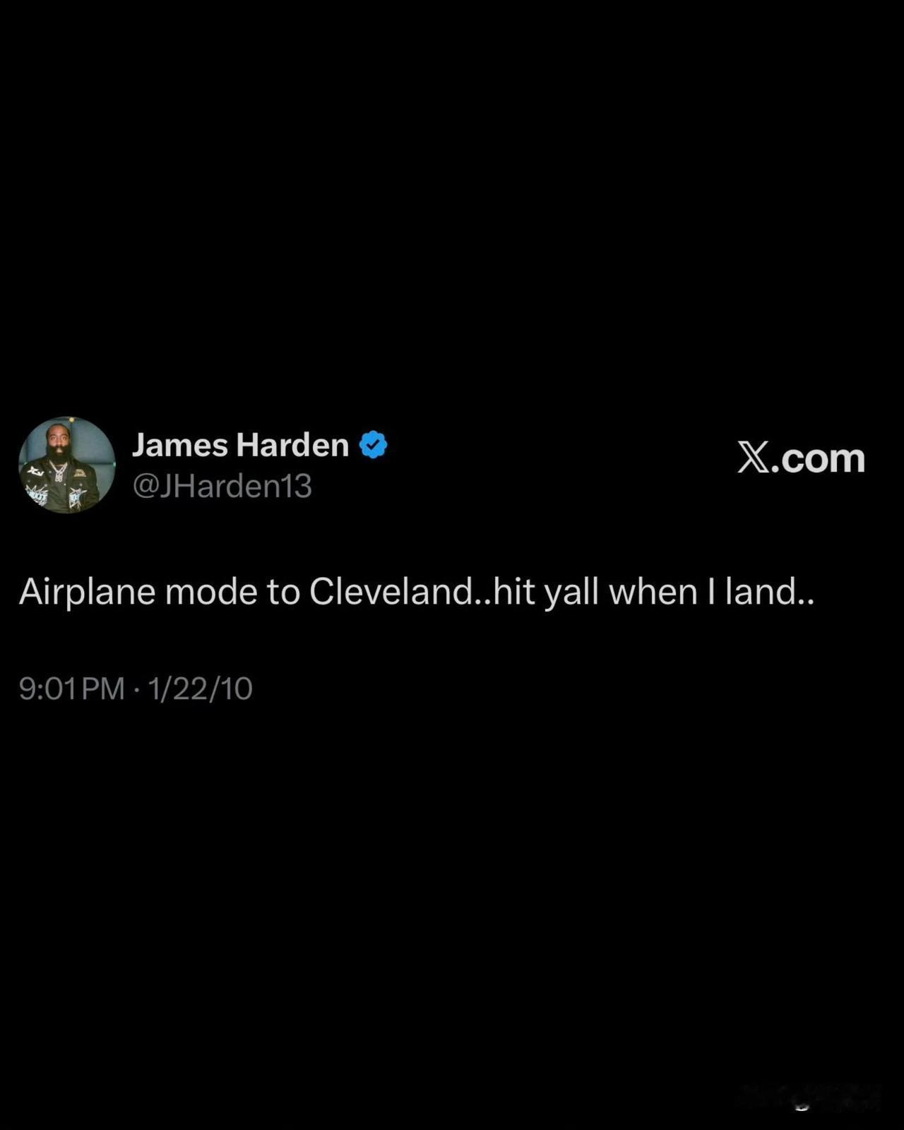 赛后哈登更新社媒: 直接把情怀拉满了! 他特意转发自己10年前发过的那条推文:「开启飞行模式飞往克利夫兰……落地后联系你们…… ✈️」 十年前只是一句随性的动态,十年后竟成了最动人的宿命呼应。 兜兜转转整个联盟,从雷霆、火箭、篮网、费城到快船,一路漂泊、一路争议、一路被看轻,如今终于正式落脚克利夫兰,他只加了两个字,却分量十足: