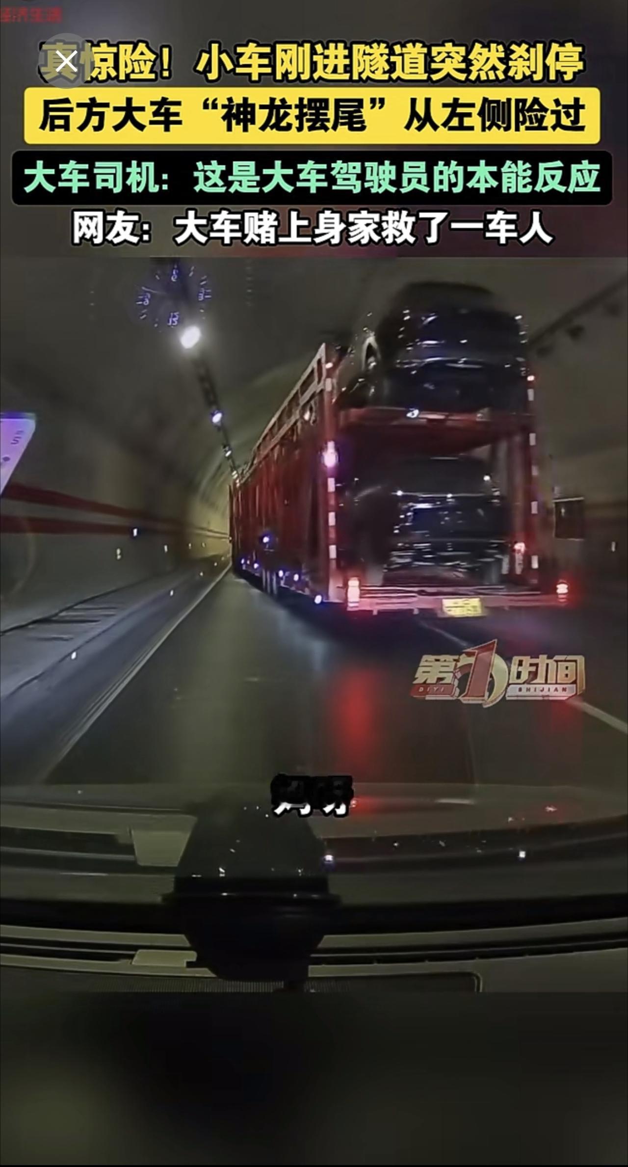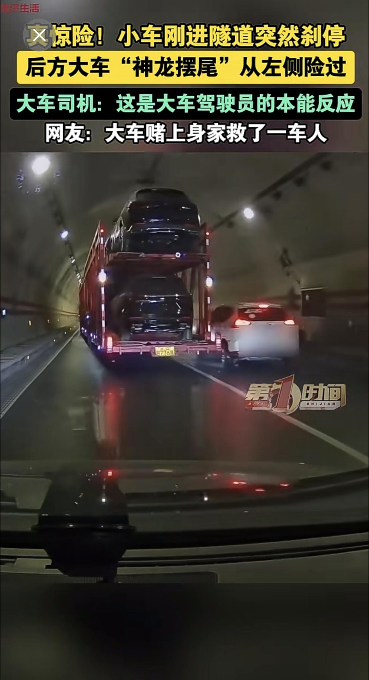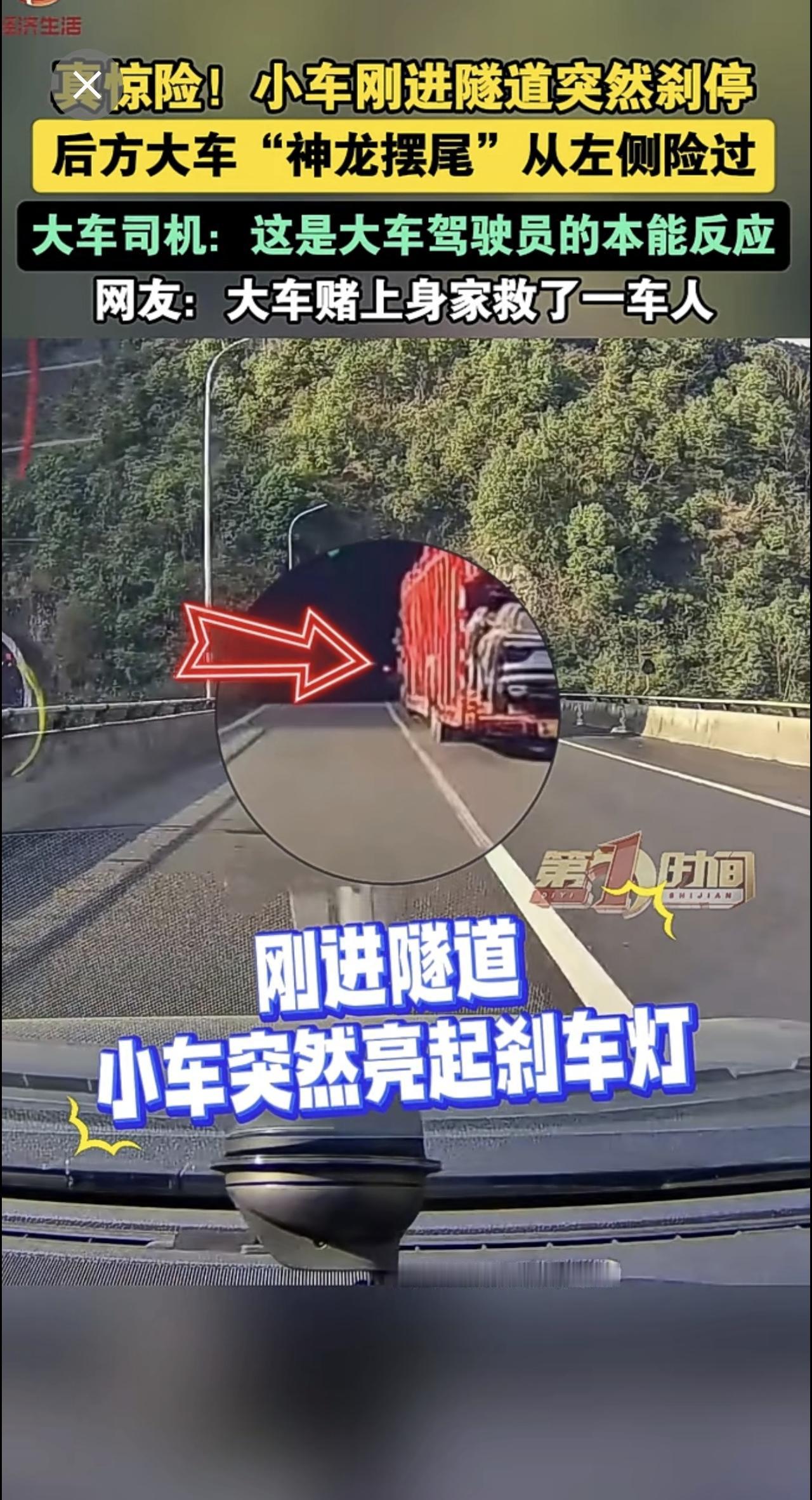 真惊险!小车刚进隧道突然刹停 ,后方大车“神龙摆尾”从左侧险过。