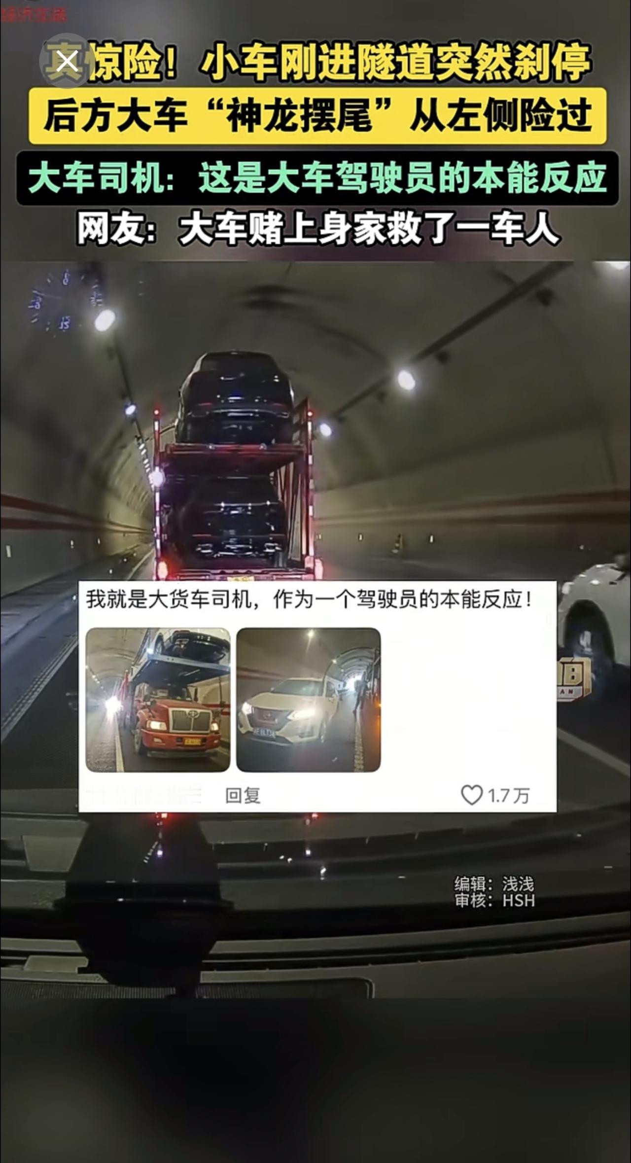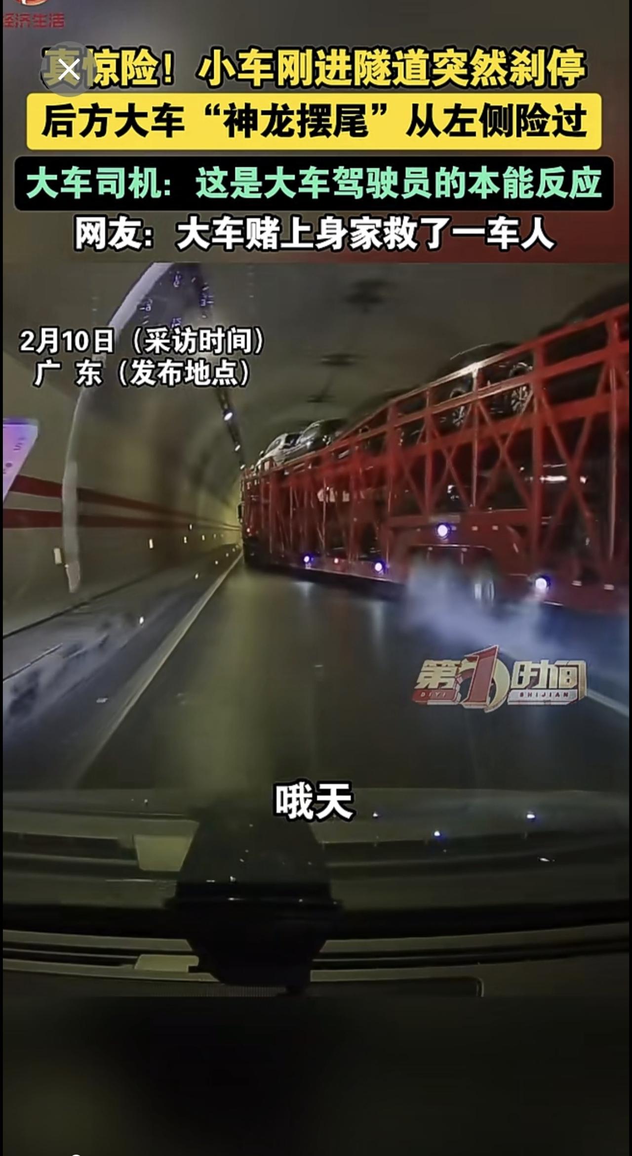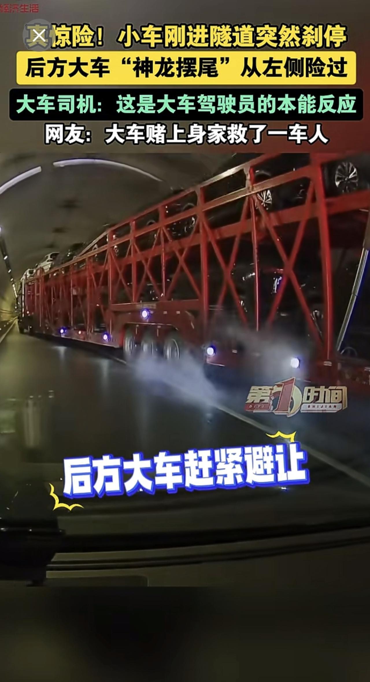 真惊险!小车刚进隧道突然刹停 ,后方大车“神龙摆尾”从左侧险过。