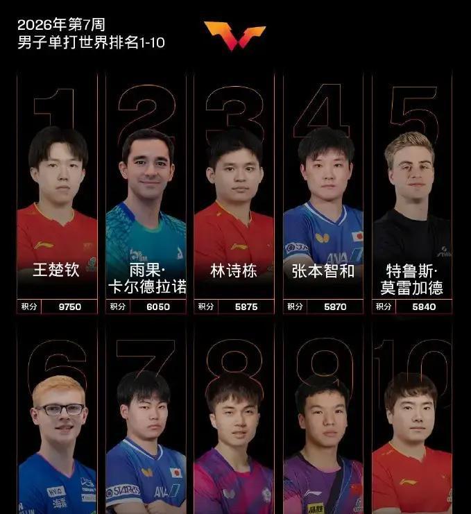 最新一周乒坛积分榜,格局又变了? 2月9日公布的2026年第7周世界排名里,男单第1仍是中国队的王楚钦,第2变成了雨果·卡尔德拉诺,第3是林诗栋,第9向鹏,第10梁靖崑,中国队依然包揽前10中的4席。 雨果从第3升到第2,只前进了“1个名次”,含金量却很高,因为这意味着他在长期被亚洲球员垄断的前3中继续站稳,个人职业生涯排名再刷纪录,也让南美乒乓在顶级赛场拥有了更清晰的“坐标点”。 女单方面,孙颖莎和王楚钦一样,继续在世界第1的位置“连庄”,王曼昱、陈幸同分列第2、第3,蒯曼排在前5,王艺迪第7,陈熠第8,前10里至少有5人来自中国队,说明高水平内部竞争和外部对手压力在同时存在。 当世界前10被少数几支队伍和少数几位核心选手长期占据时,这样的格局在未来1到2年会带来更多稳定还是更多变数,你更期待看到新人冲进前5,还是老将在这种高压排名竞争下打出怎样的应对?