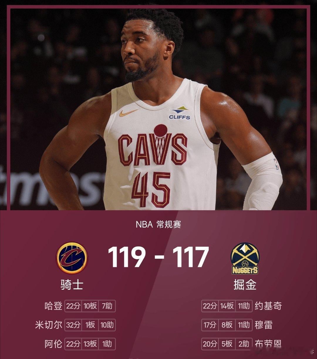 骑士vs掘金nba 掘金117-119不敌骑士。米切尔砍下全场最高的32分1板10助,并且完成罚球准绝杀,率领骑士成功取胜。