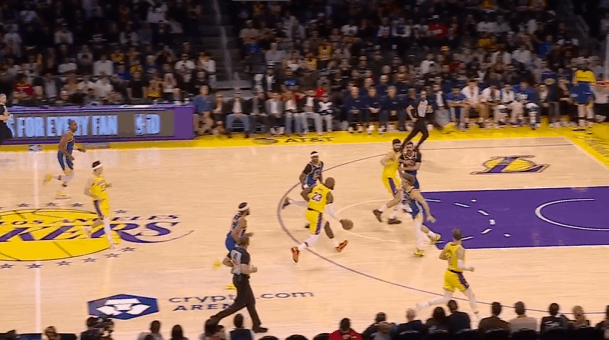 P6底线球回合,肯纳德借队友两道无球掩护兜至底角接球,利用投射威胁、牵制力吸引夹击后:先是佯攻出球给弧顶的詹姆斯——成功误导回收至油漆区伺机协防的追防,随后迅速出球给顺下的克勒贝尔,助其隔着梅尔顿篮下终结得手。
