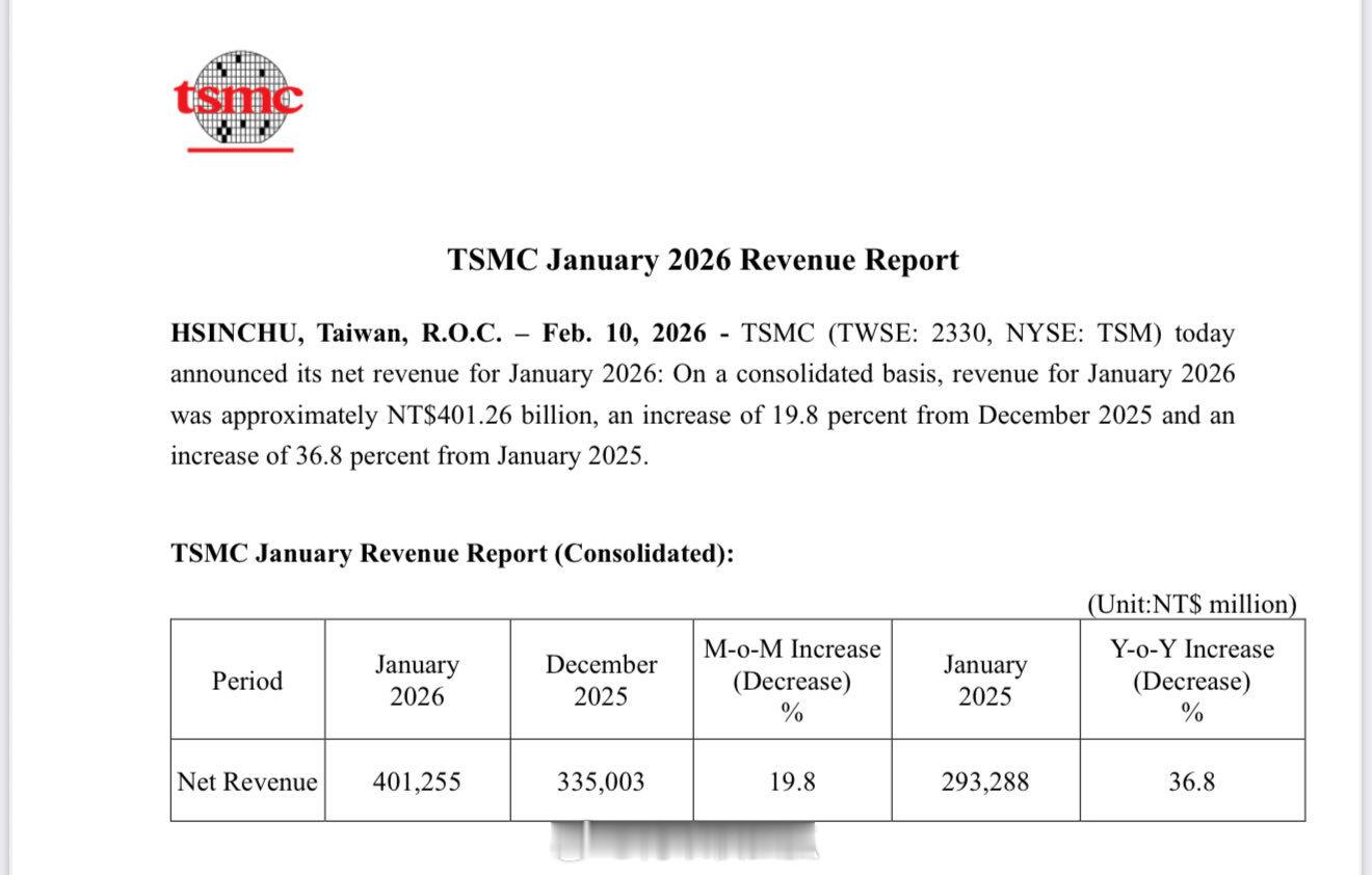 台积电1月营收年增36.8%至4012.5亿,月增19.8%再创历史新高……