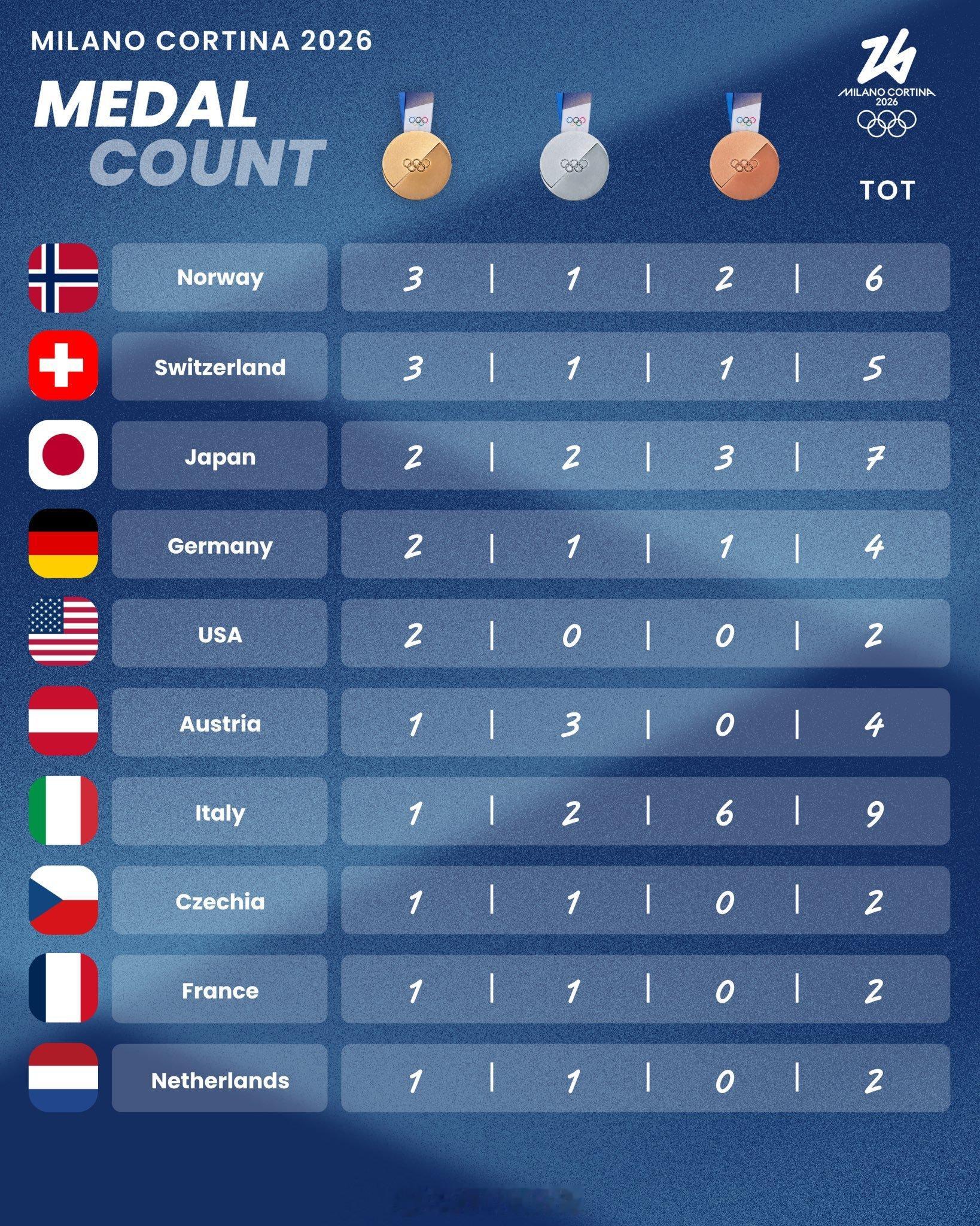 全民聊冬奥 2026米兰冬奥会第三天奖牌榜