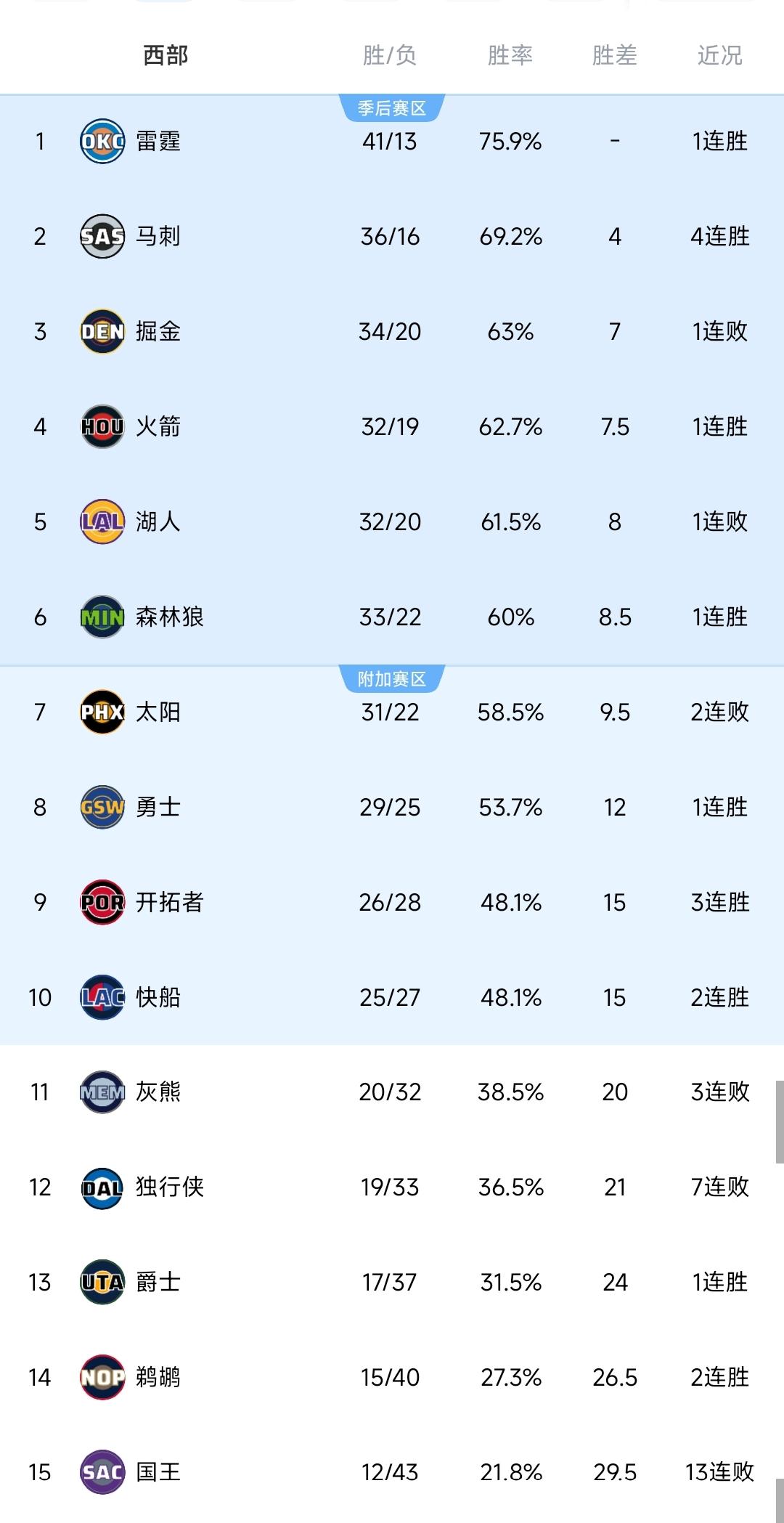 NBA西部排名出炉, 第3到第7只差2.5个胜场! 湖人连胜终结,勇士绝杀! ①国王94-120惨败鹈鹕,首节勉强僵持,从次节逐渐发展成一边倒趋势。国王遭遇12连败,12胜42负的战绩位列西部垫底位置,替补则是倒数第二。 ②森林狼138-116大胜老鹰,全民皆兵是火力全开,流畅进攻简直挡不住,上半场狂轰81分奠定基石,此后没给对手任何喘息的机会,高歌猛进带走胜利,全队七人得分上双,33胜22负战绩排名西部第六。 ③掘金117-119憾负骑士,绝大部分时间他们都占上风,虽说无法彻底甩开对手,但总能及时回应稳住优势,本来末节一度都看到胜利曙光,却在最后阶段没能顶住,惨遭哈登命中扳平3分,接着又犯规送米切尔罚球绝杀,西部第3的位置已经不稳。 ④开拓者135-118大胜76人,上半场相互纠缠,下半场卡马拉和阿夫迪亚联手掀起猛攻号角,一波流建立优势,并且没给反扑的希望,杨瀚森末节出战五分钟4中1得到2分1篮板。 ⑤勇士114-113绝杀灰熊,核心主力纷纷缺席,格林带队展现韧性,角色球员纷纷站出来给予帮助,全民皆兵是紧追不舍,最后老将霍福德关键篮板,桑托斯补进上演准绝杀。 ⑥湖人110-119不敌雷霆,比赛过程磕磕绊绊,进入下半场本有好转迹象,一度又取得微弱领先,结果关键第四节没能顶住压力,等到被甩开些许差距,再想追赶为时已晚。