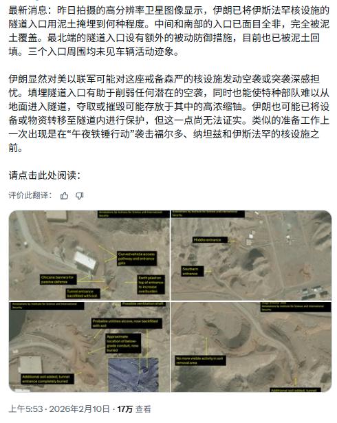 最新消息显示,尽管美国和伊朗在相互威胁下还坚持谈判,但是很明显双方对于战争的准备一直没有停止。伊朗显然是吸取了去年12日战争经验,虽然当时也对核设施做了处理,但是还是受到了较大损失,这次伊朗保护核设施动作更加的快准狠! 2026 年 2 月 9 日的高分辨率卫星图像显示,伊朗伊斯法罕核设施的三个隧道入口均已被泥土回填:中间与南部入口被完全覆盖、面目全非,最北端入口(此前已增设被动防御)也已回填,且三处入口周边均无车辆活动迹象。 伊朗显然对美以联军可能对这座戒备森严的核设施发动空袭或突袭深感担忧。填埋隧道入口有助于削弱任何潜在的空袭,同时也能使特种部队难以从地面进入隧道,夺取或摧毁可能存放于其中的高浓缩铀。 本次行动与 “午夜铁锤行动” 前的准备高度相似,核心是削弱空袭效果、阻止特种部队地面突入,并可能掩护隧道内关键设备 / 高浓缩铀的转移与保护。 根据最新的图片可以看到以下具体情况被改变: 中间入口:门体及相邻壁龛入口被泥土完全封堵,地表无明显入口痕迹。 南部入口:经工程机械作业后被新土全面覆盖,入口轮廓消失。 北端入口:在既有被动防御基础上完成回填,此前曾有车辆活动迹象(用于资产转移可能性高)。 目前核设施不易被发现,也不容易被侦察标记。因为它的入口周边无车辆与机械活动,显示回填作业已完成,进入静默防御状态。 美以持续威胁对伊朗核设施采取 “预防性打击”,以色列多次演练针对伊斯法罕等目标的远程突袭,伊朗此举明显是针对被袭击风险下的防御措施。 从伊朗的本次行动看,伊朗短期内应该不会重新开启入口,短期内伊朗更可能维持封闭状态,优先保障地下资产安全。而且说不定现在每天都有美国的侦察机在侦察具体核活动和坐标,而且核设施的入口被覆盖后,外部难以通过卫星监测隧道内活动,增加对伊朗核材料存储与转移的判断难度。 伊朗此次全面回填伊斯法罕核设施隧道入口,是在美以军事威胁加剧背景下的预防性防御升级,兼具抗打击、防突入与隐蔽资产三重目标。 这一动作既体现伊朗对核设施安全的高度重视,也反映其对地区冲突升级的现实担忧。