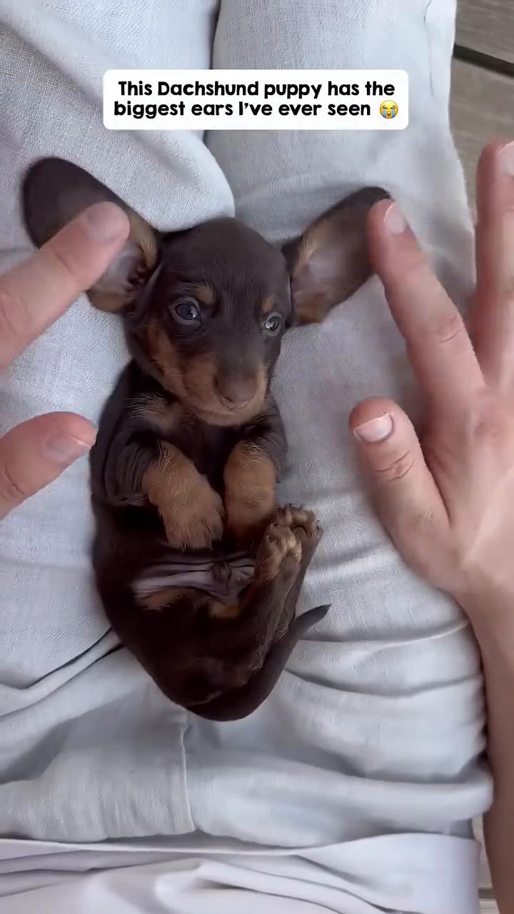 This Dachshund puppy has the biggest ears I've ever seen.They're almost bigger than his entire body.Pretty sure those ears could help him take off fu.Look at those tiny toe beans too.Being this cute is really exhasuting.
