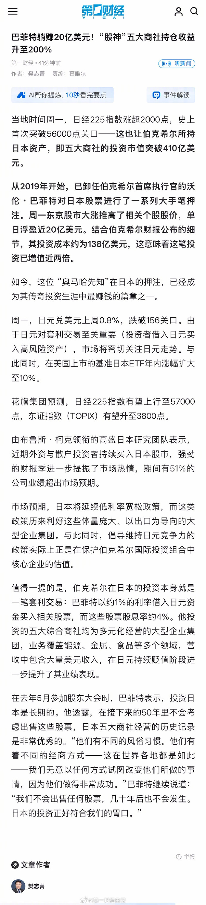 #巴菲特赚麻了#【#巴菲特躺赚20亿美元# !#股神五大商社持仓收益升至200%#】当地时间周一,日经225指数涨超2000点,史上首次突破56000点关口——这也让伯克希尔所持日本资产,即五大商社的投资市值突破410亿美元。从2019年开始,已卸任伯克希尔首席执行官的沃伦・巴菲特对日本股票进行了一系列大手笔押注。周一东京股市大涨推高了相关个股股价,单日浮盈近20亿美元。结合伯克希尔财报公布的细节,其投资成本约为138亿美元,这意味着这笔投资已增值近两倍。如今,这位 “奥马哈先知”在日本的押注,已经成为其传奇投资生涯中最赚钱的篇章之一。 (第一财经日报)