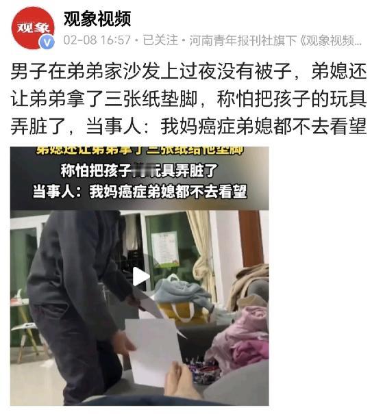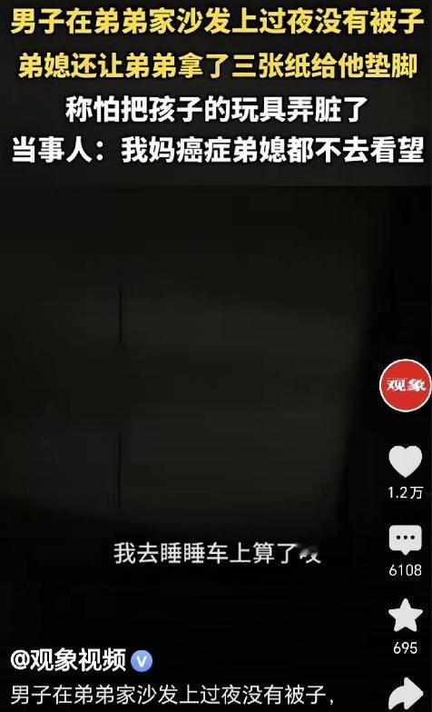 寒心!广东,一男子在弟弟家过夜,晚上睡在沙发,沙发上没有被子,男子和衣躺下,弟媳让弟弟拿来三张纸垫他脚下,怕他把孩子玩具弄脏,男子立刻起身,决定下楼睡到车上,男子越想越气: 我妈癌症弟媳都不去看望!网友: 不怪弟媳,要怪就怪弟弟!更有人说,是不是弟媳坐月子时,你妈没有管过? 广东这名男子和弟弟从小一起长大,兄弟俩感情一直还算不错,平日里也经常来往,互相照应。事发当天,男子因为一些琐事,没能及时赶回自己家, 天色已晚,实在不方便赶路,就临时决定去弟弟家过夜,本以为都是一家人,弟弟和弟媳会热情招待,哪怕简单凑合一晚,也不会太委屈。 赶到弟弟家时,已经是深夜,弟弟和弟媳还有孩子都已经准备休息,看到男子突然来访,弟弟虽然有些意外,但还是热情地让他进了门。 得知男子要在这里过夜,弟弟面露难色,家里房间有限,已经没有多余的床位,只能让男子暂时睡在客厅的沙发上,还连连道歉,说委屈他一晚。 男子并没有在意,毕竟都是一家人,凑合一晚也没什么,他笑着表示没关系,沙发就很好,不用特意麻烦。 可让他没想到的是,沙发上不仅没有枕头,连一条盖的被子都没有,夜里气温偏低,哪怕和衣躺下,也难免会觉得冷,可他想着,忍一忍就过去了,没必要计较这些小事。 就在他刚躺下没多久,弟媳就从房间里走了出来,手里拿着三张普通的白纸,没有和他说任何多余的话,只是示意弟弟,把这三张纸垫在男子的脚下。 男子一开始还没明白是什么意思,直到看到脚下散落的孩子玩具,才瞬间反应过来,弟媳是怕他的鞋子弄脏孩子的玩具,才特意拿纸垫在他脚下,划清界限。 那一刻,男子的心里像被泼了一盆冷水,瞬间凉透了。他觉得自己受到了极大的羞辱,都是一家人,就算怕弄脏玩具,也不用这样刻意防备, 更何况他还是孩子的大伯,临时来借宿一晚,竟然被这样对待。一股怒火瞬间涌上心头,他没有多说一句话,立刻起身,拿起自己的东西,就朝着门外走去。 弟弟见状,连忙上前阻拦,不停劝说男子,让他别生气,弟媳也没有恶意,只是太在意孩子的玩具了,可男子心意已决,任凭弟弟怎么劝说,都不肯停下脚步。 他走出弟弟家,径直下楼,打开自己的车门,不顾夜里的寒冷,直接躺在了车里,那一刻,委屈和愤怒交织在一起,让他越想越气。 他越想越觉得不值,自己平日里也没亏待过弟弟一家,弟弟有困难的时候,他总是第一时间伸出援手,可到头来,自己只是临时借宿一晚,却被弟媳这样轻视、防备。 更让他寒心的是,之前他的母亲患上癌症,住院治疗了很长一段时间,作为儿媳的弟媳,竟然一次都没有去医院看望过,连一句关心的话都没有。 男子越想越委屈,忍不住把自己的遭遇,还有弟媳不去看望患癌母亲的事情,一起分享到了网上,本想吐槽一下自己的委屈,发泄心里的怒火,没成想,这条内容一发出去,很快就引发了网友们的热烈讨论,瞬间吵翻了天。 不少网友看到后,并没有一边倒的同情男子,反而有很多人留言表示,不怪弟媳,要怪就怪弟弟。有人猜测,弟媳之所以这样对待男子,又不肯去看望患癌的婆婆,大概率是有原因的,不会平白无故就如此冷漠。 还有很多网友留言追问,是不是弟媳坐月子的时候,男子的母亲没有帮忙照顾,没有尽到婆婆的责任,才让弟媳记恨在心,一直无法释怀。 一时间,各种猜测层出不穷,有人同情男子的委屈,觉得弟媳太过冷漠绝情,就算有矛盾,也不该在男子借宿时如此羞辱他,更不该不去看望患癌的婆婆; 也有人觉得,事出必有因,弟媳的冷漠背后,大概率藏着不为人知的委屈,毕竟没有哪个女人,会平白无故敌视自己的婆家亲人。 男子看着网友们的各种猜测和讨论,心里的委屈并没有减少多少。他表示,自己从来没有听说过弟媳和母亲之间有什么大的矛盾,也不知道弟媳为什么不肯去看望母亲,更不明白,自己只是临时借宿一晚,为什么会被这样对待。 对此,你们有什么看法,欢迎评论留言~