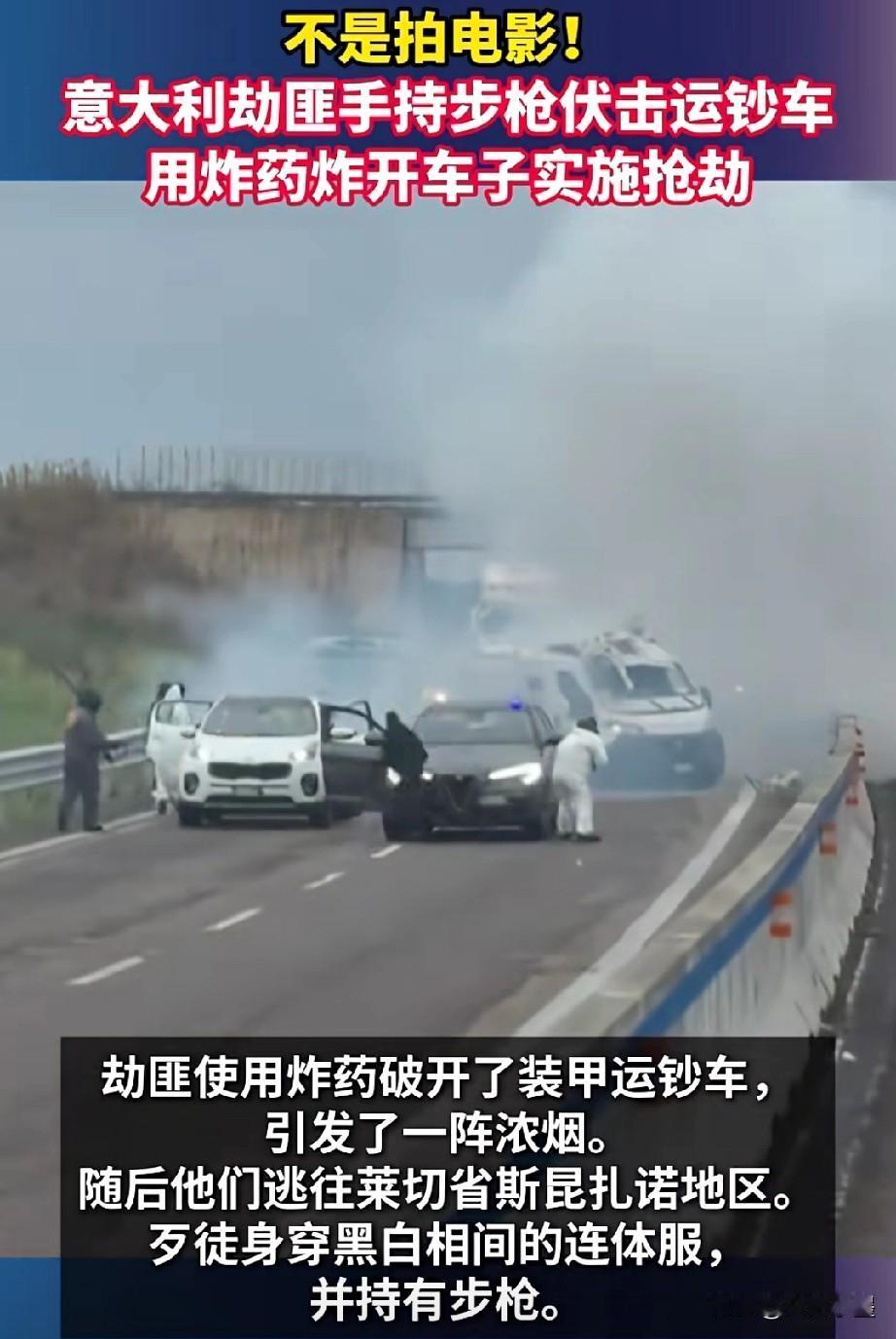 意大利这几名劫匪太猛了,竟然敢在光天化日之下抢劫运钞车。 他们身穿白色连体服,戴着黑色头套,手持AK47,把运钞车拦截后,想要用炸药炸破运钞车车厢实施抢劫。 前来救援的意大利警方与劫匪发生了激烈交火,现场火光四射,浓烟滚滚,感觉像是在拍电影大片! 最终,由于爆炸触发了运钞车安全装置,不但未能抢劫成功,还有两人被现场抓获!其余人员拦截了一辆汽车逃跑了! 感觉这帮劫匪不太专业,首先是穿着连体衣会导致行动不便,其次在高速上抢了以后往哪跑,从哪里下高速,除非提前安排好了接应的人,从中途下车逃离,不然会被警察堵在高速上的!