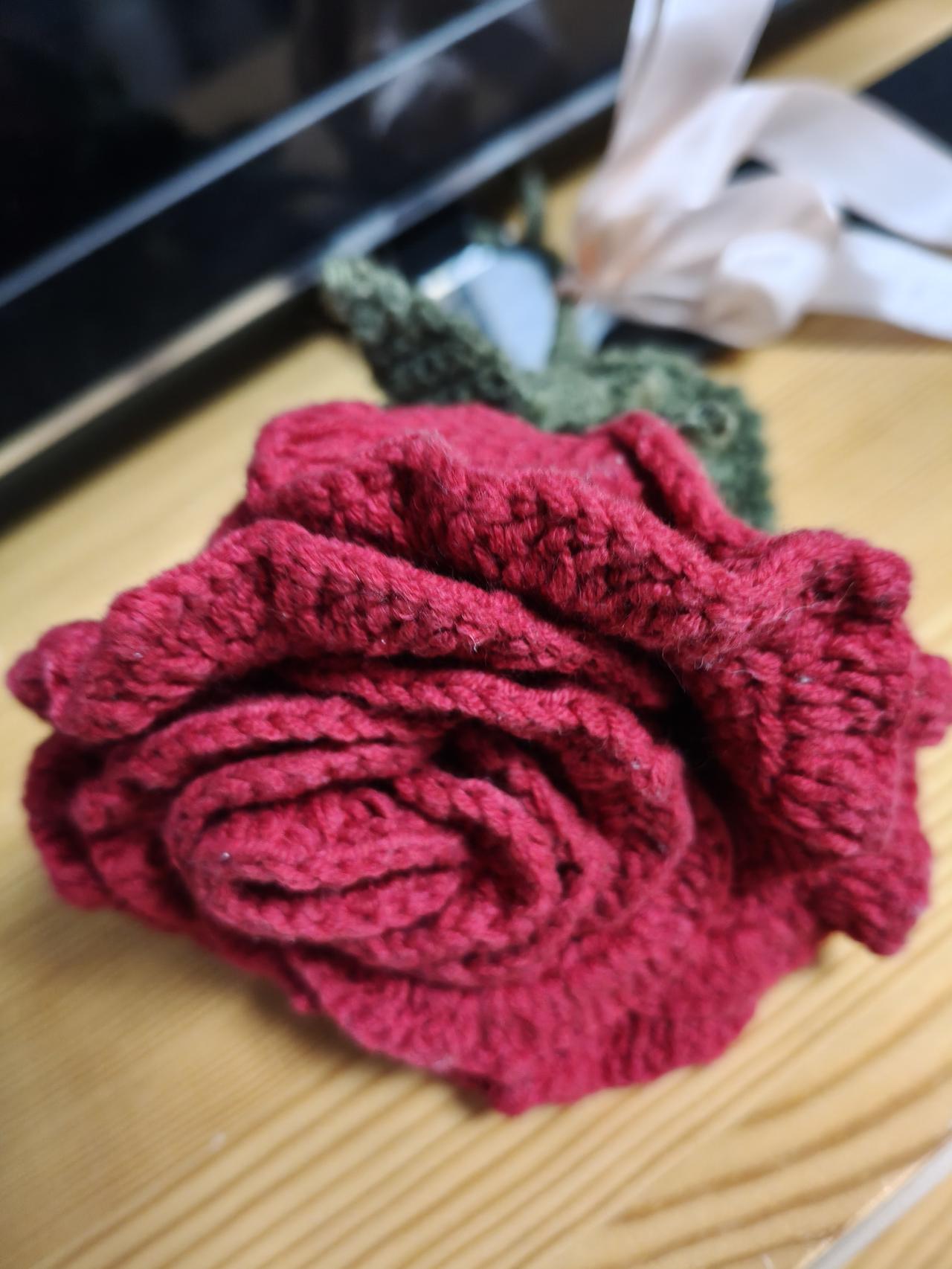 上次在家中发现一枝盛开的玫瑰花,一问才知道,是女儿用毛线钩出来的! 闺女的动手能力太强大了,上小学时,折纸,看图一遍就会,魔方更是手到擒来! 祝福友友们小年快乐,不发脾气只发财! 财源滚滚从头釆!