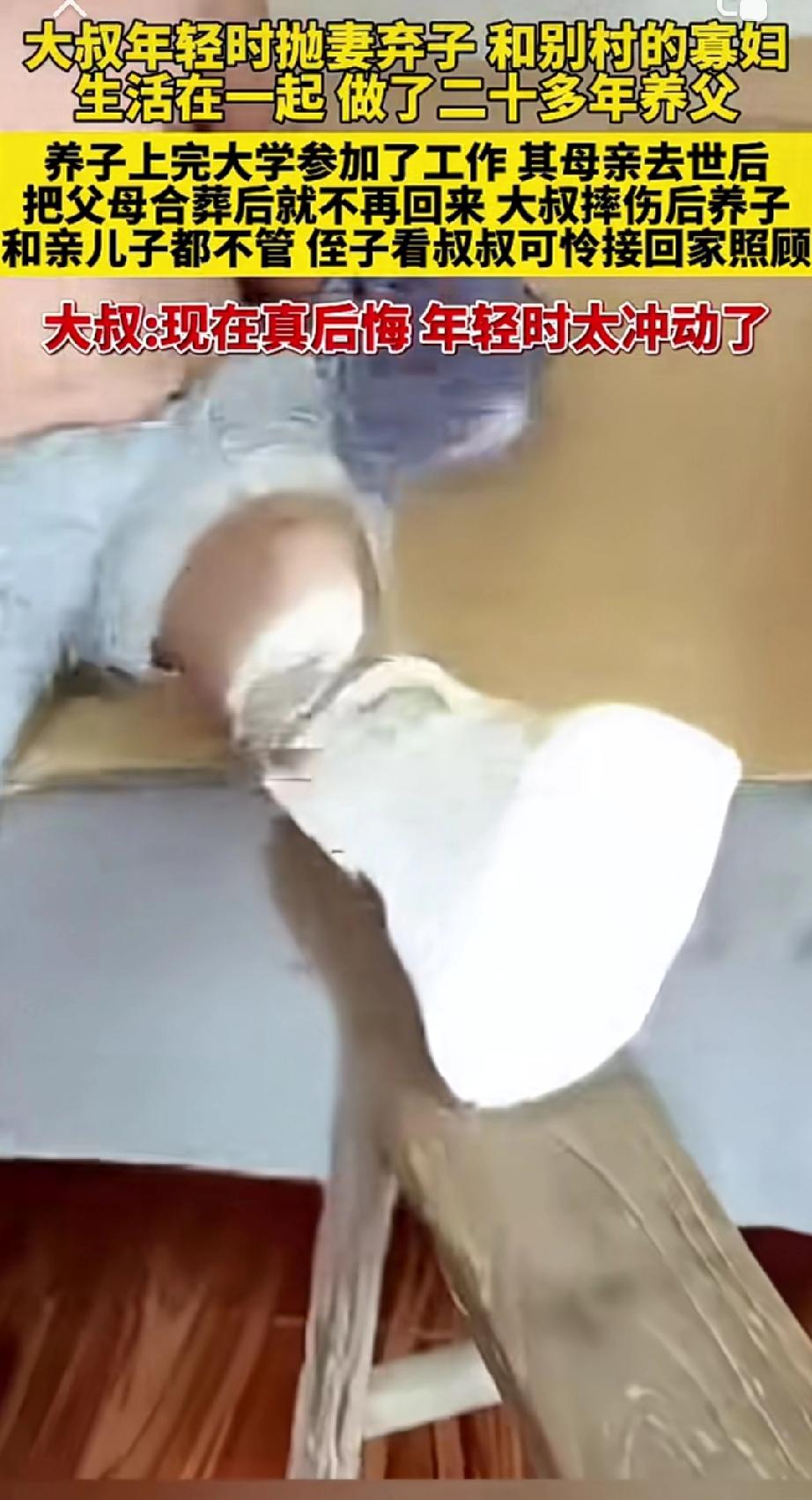 孰是孰非?山东一位50多岁大叔,年轻时不顾妻儿,跟寡妇生活,辛苦养大养子20多年。如今大叔瘫痪在床,养子直接翻脸不认人,亲生儿子也记恨他,晚年无依无靠,只剩后悔。 20多年前,大叔本来自己有老婆孩子,日子过得普通但安稳。可邻村一个寡妇长得好看,又显得可怜,他就动了心思,硬是狠心离开原来的家,去和寡妇一起生活。 他把寡妇的儿子当成自己的亲骨肉,拼命干活供他读书、帮他买房,心想:“我老了就靠这孩子了。” 可这一切,在寡妇去世后全碎了。养子悄悄安排自己亲爹亲妈合葬,等于明明白白告诉所有人:这个养父,什么也不算。 更寒心的是,大叔摔瘫痪后,养子连管都不管。打电话过去,只换来一句:“跟我没关系。” 而亲生儿子那边呢?多年来缺失的陪伴,早已在孩子心里筑起了高墙。亲情断了线,似乎怎么也接不回来了。 最后,是大叔的侄子看不下去,接他回去照顾。忙活大半辈子,落得两头空。 有人说养子无情,有人说他活该。但仔细想想,这故事的深处,没有绝对的坏人,只有复杂的人性与选择。 对养子而言,他心中始终站着一位生父。二十多年的养育之恩是真的,但那份对血缘的执着、对“外人”身份的隐秘介意,也可能一直存在。母亲在世时,关系尚有纽带;母亲一走,那份未曾真正接纳的疏离便浮现出来。 对亲生儿子而言,父亲当年的离开,是童年就被撤走的依靠。缺失的陪伴与父爱,化成了一道难以跨越的隔阂。恨里有痛,痛里有渴望,但时光已无法重来。 而对他来说,当初一步踏错,余生都在偿还。他以为自己在建设新家,却同时摧毁了旧家;他以为用付出能换归属,却忘了亲情需要血缘、认可与名分的共同支撑。 没有根的树,经不起风雨;没有双向奔赴的付出,终难结出善果。 这个故事残忍,却也真实。它告诉我们: · 有些选择,代价是一生。 · 责任不能转让,亲情无法代偿。 · 人到最后,兜兜转转,逃不过自己种下的因。 但愿每个人在做出选择前,都能多想一步:你担得起那份后果吗?你准备好失去已有的一切了吗?