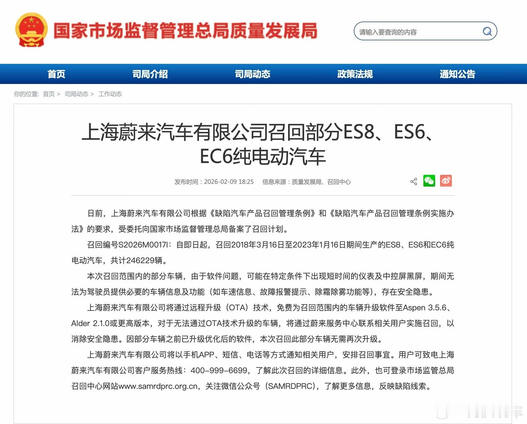 召回的车辆批次主要是:2018年3月16日到2023年1月16日期间生产的ES8、ES6和EC6纯电动汽车。