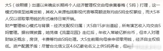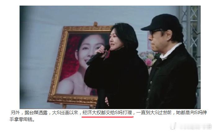 大S经济大权都交给S妈打理大S出道以来,经济大权一直都交给S妈打理,家事财务本就有成熟稳定的安排。再加上具俊晔从一开始就明确放弃遗产继承权,不贪一分一毫,有时候利益面前最见人心