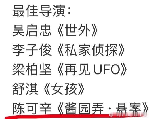 酱园弄金像奖提名最佳导演陈可辛和最佳女主章子怡,其余女配男配均无提名